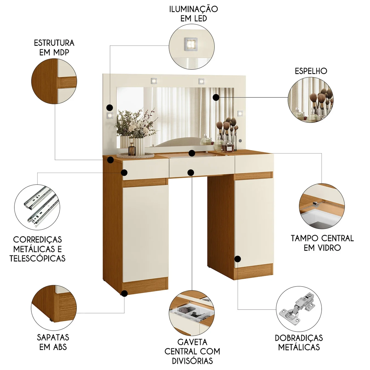 Seu tampo possui um visor de vidro, proporcionando uma visão clara e prática dos seus itens, além de agregar sofisticação ao design. As gavetas laterais da Penteadeira, equipadas com corrediças metálicas, oferecem um deslizamento suave e maior durabilidade. A gaveta central, com corrediças telescópicas e divisórias organizacionais, ajuda a manter seus produtos de maquiagem e acessórios bem organizados e ao alcance das mãos.