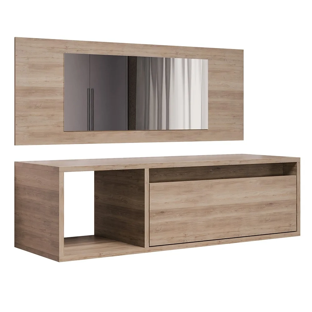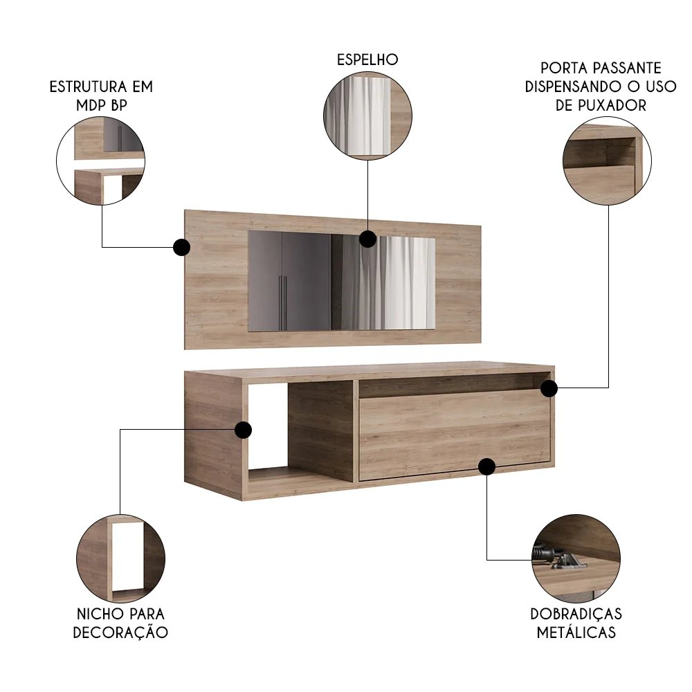 Com design minimalista, essa penteadeira suspensa, além de otimizar espaço de circulação, ainda conta com um compartimento interno, ideal para organizar os itens de maquiagens, produtos skincare e demais acessórios de beleza. Já o nicho é um ótimo aliado para dispor alguma decoração e deixar o espaço ainda mais acolhedor. Ahh, lembrando que é uma penteadeira com espelho, ou seja, um móvel completo para você se olhar e se sentir ainda mais bela e incrível.