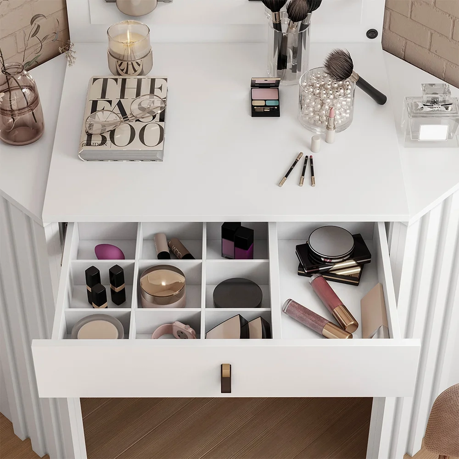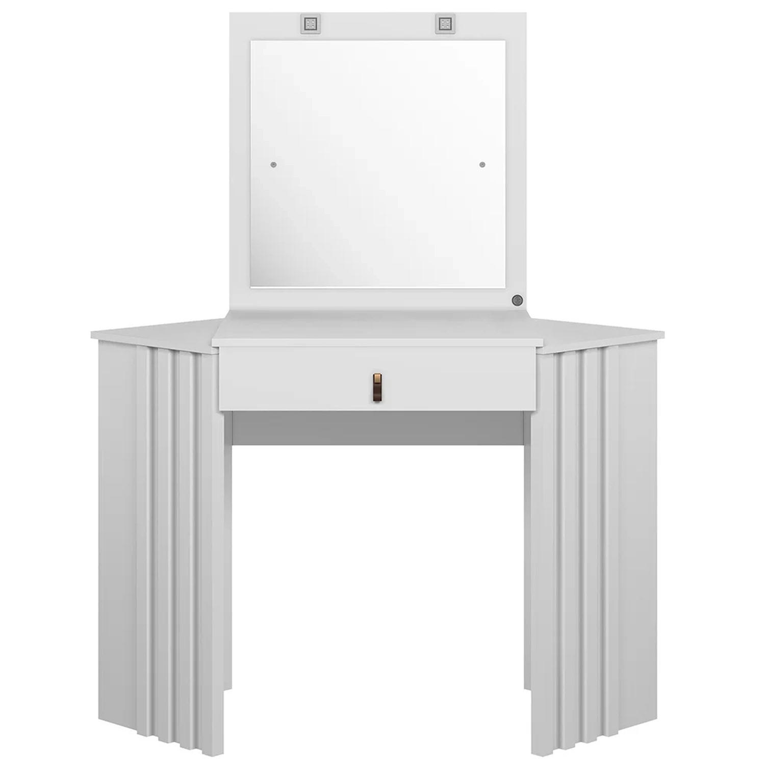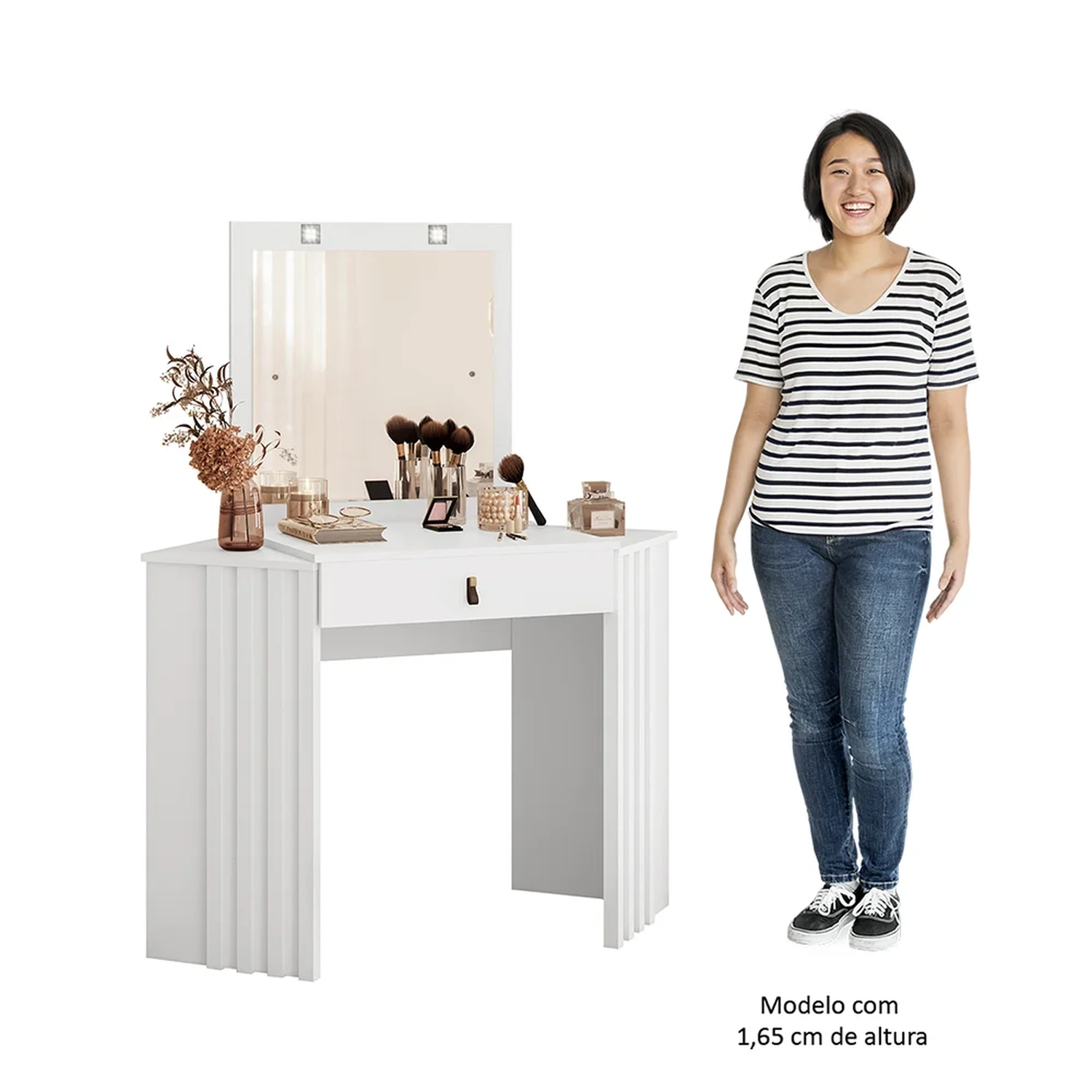 Além disso, essa penteadeira de canto não é apenas prática, mas também dá um toque de sofisticação a qualquer espaço. O puxador em ABS com acabamento em sintético exala elegância, enquanto as laterais com acabamento ripado criam uma estética moderna. Se você quer um cantinho só seu para elaborar as mais diversas makes e, ainda, dar um toque especial ao seu quarto, essa penteadeira com LED é a escolha perfeita. Isso mesmo, com LED para você iluminar a sua rotina de beleza e proporcionar uma iluminação ideal para que você possa aplicar maquiagem sem esforço ou pentear o cabelo com precisão. Diga adeus aos cantos mal iluminados e dê as boas-vindas a uma área bem iluminada, dedicada aos seus cuidados pessoais.