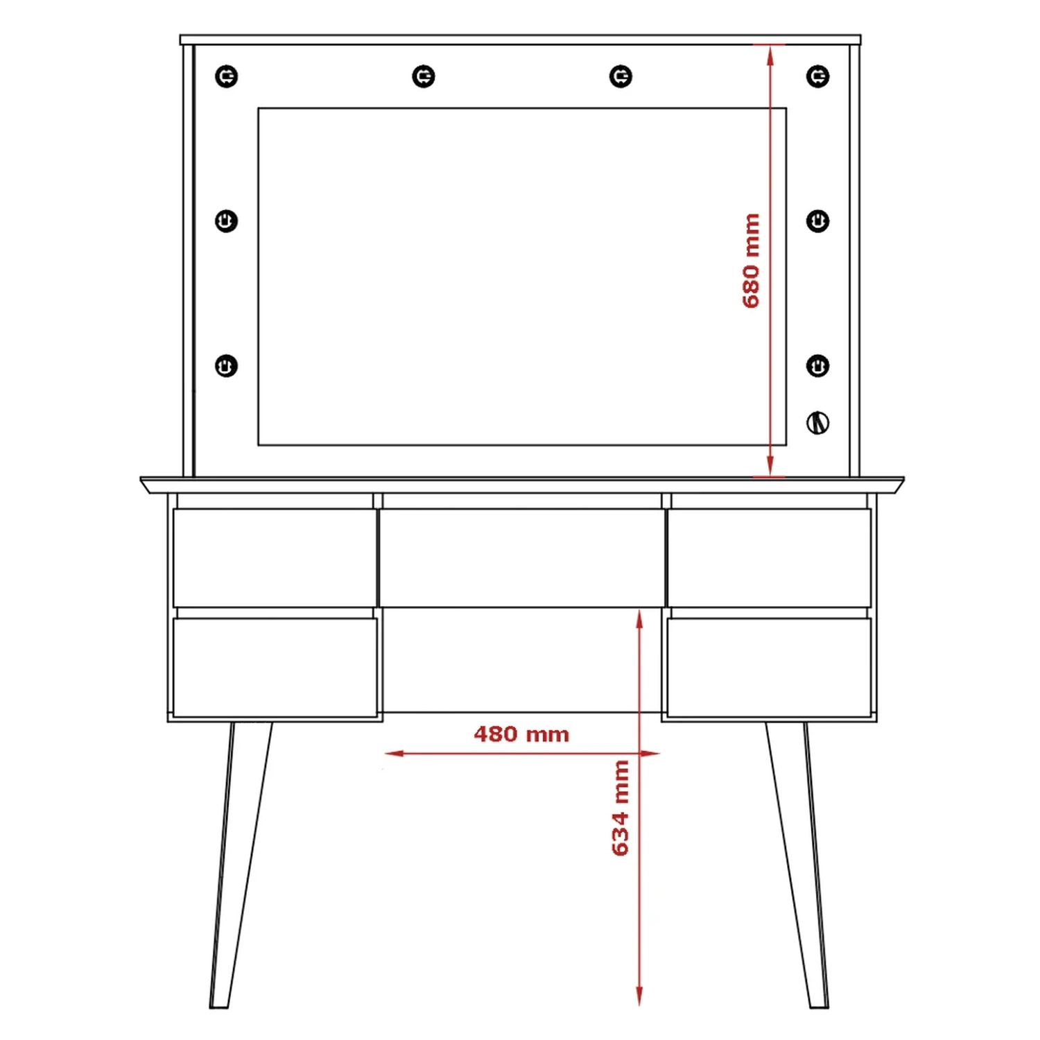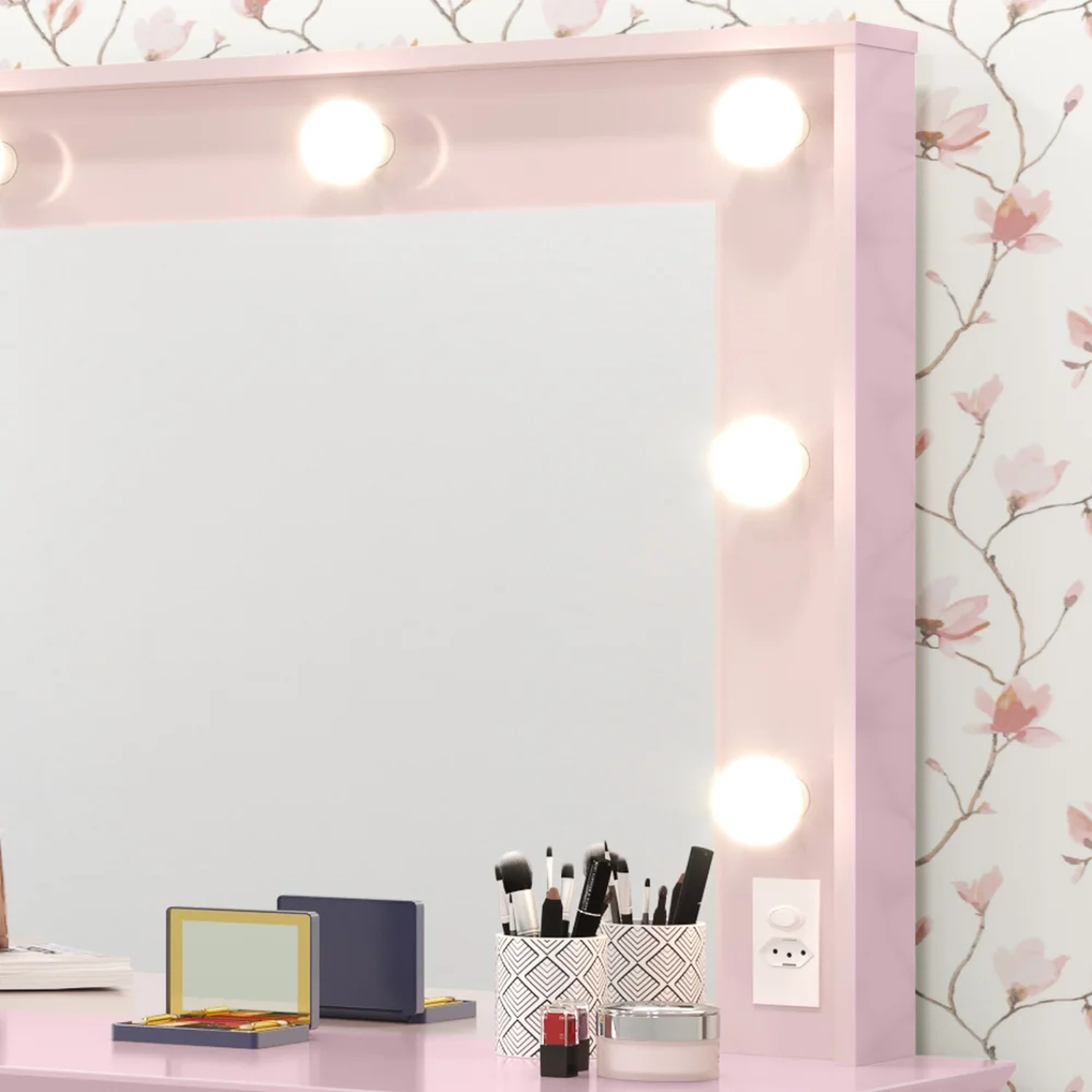 A Penteadeira Camarim Strass é a junção do moderno e útil, uma ótima opção para o seu quarto ou closet, confira! Ela possui 5 gavetas de deslize suave com amplo espaço interno, ótima para armazenar seus objetos pessoais e até conta com interruptor e tomada acoplados para não deixar você na mão! Mas o que chama mais atenção é sem sombra de dúvidas o espelho cercado de lâmpadas de Led, proporcionando uma iluminação perfeita na hora de se maquiar ou tirar aquela selfie!