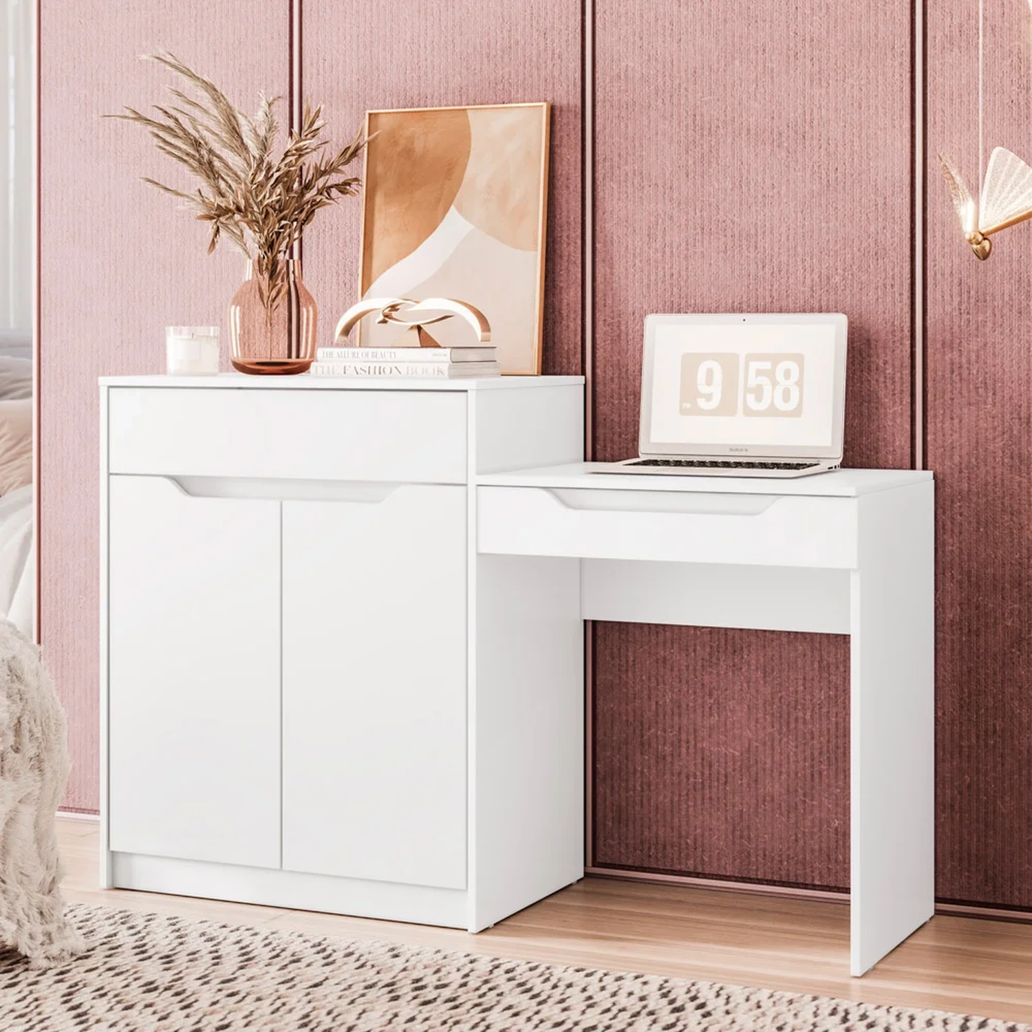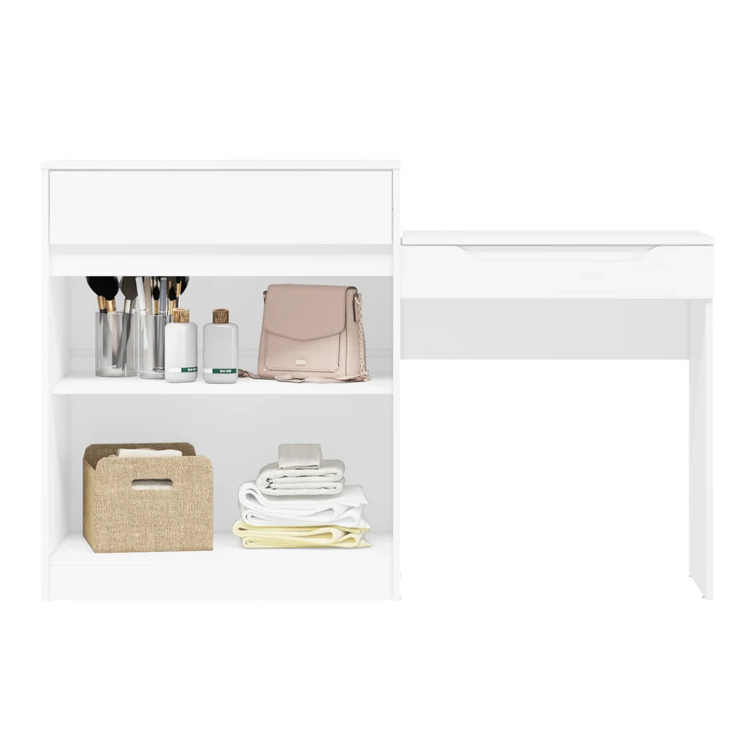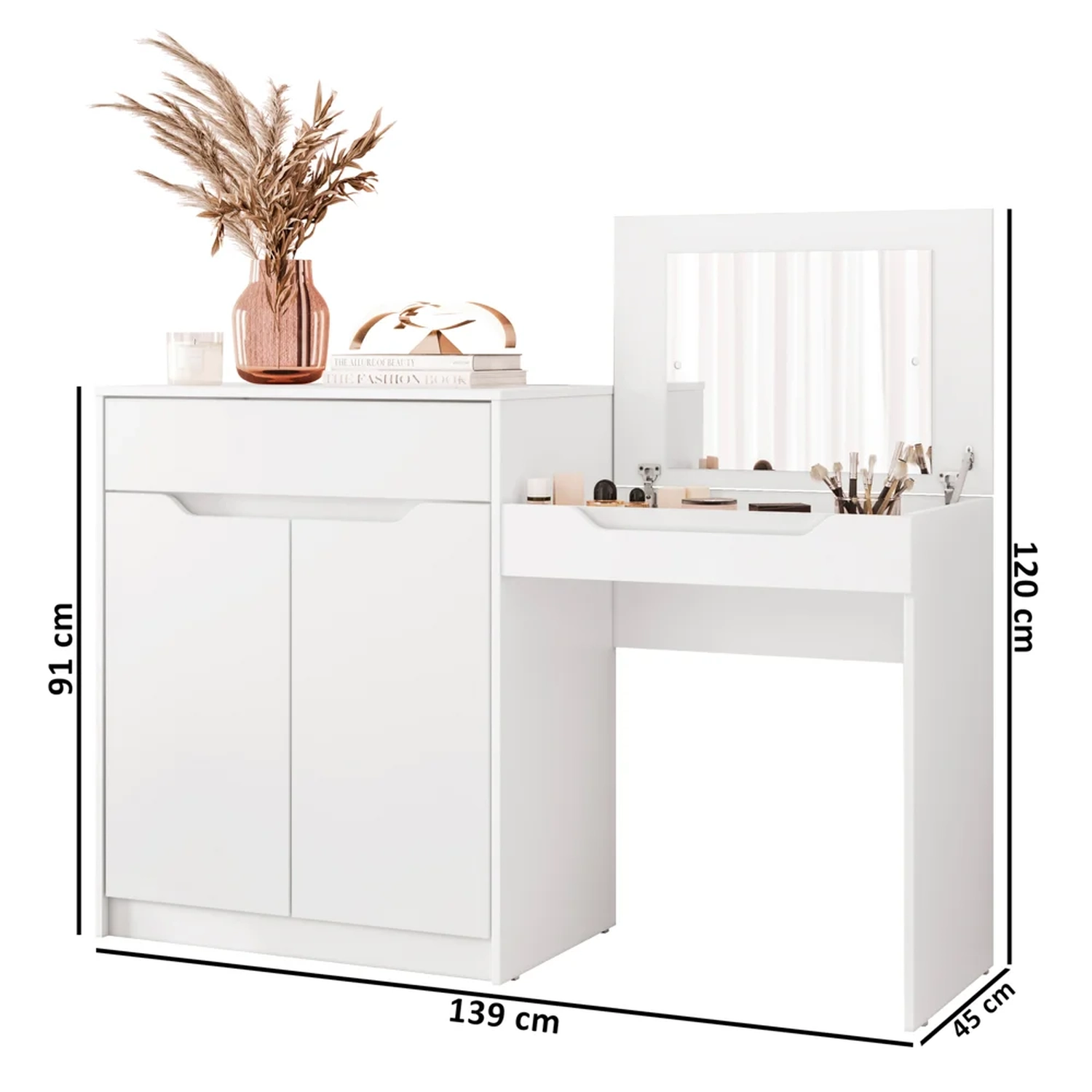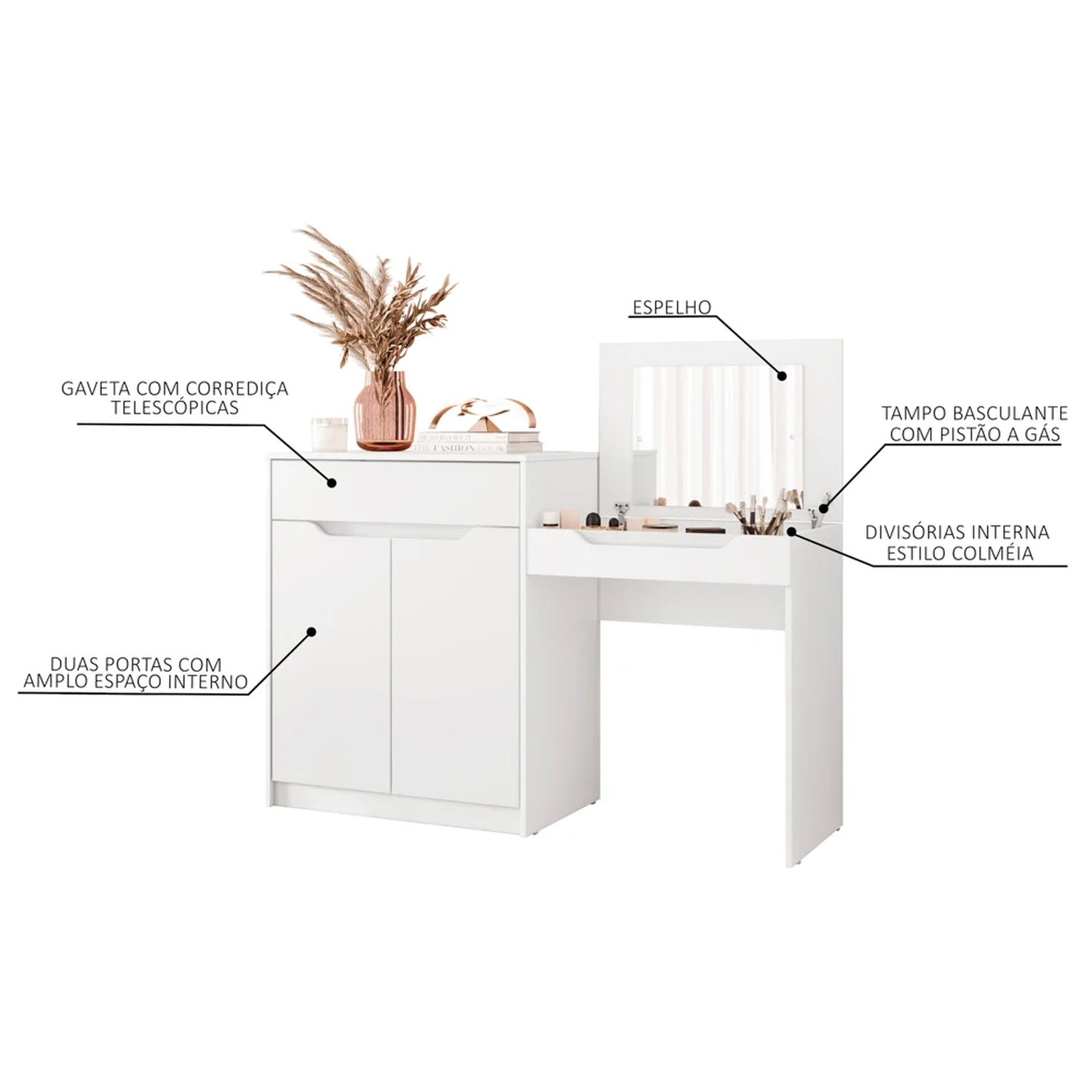 Criada com atenção meticulosa aos detalhes, essa penteadeira com escrivaninha conta 2 portas com um amplo espaço de armazenamento para todos os seus itens essenciais. Já o tampo basculante, ao abri-lo, você terá seu lugar perfeito para guardar de cosméticos e joias à artigos de papelaria e documentos, graças ao nicho e colmeia internos. E não vamos nos esquecer da conveniente gaveta, que acrescenta um toque extra de organização à sua vida.