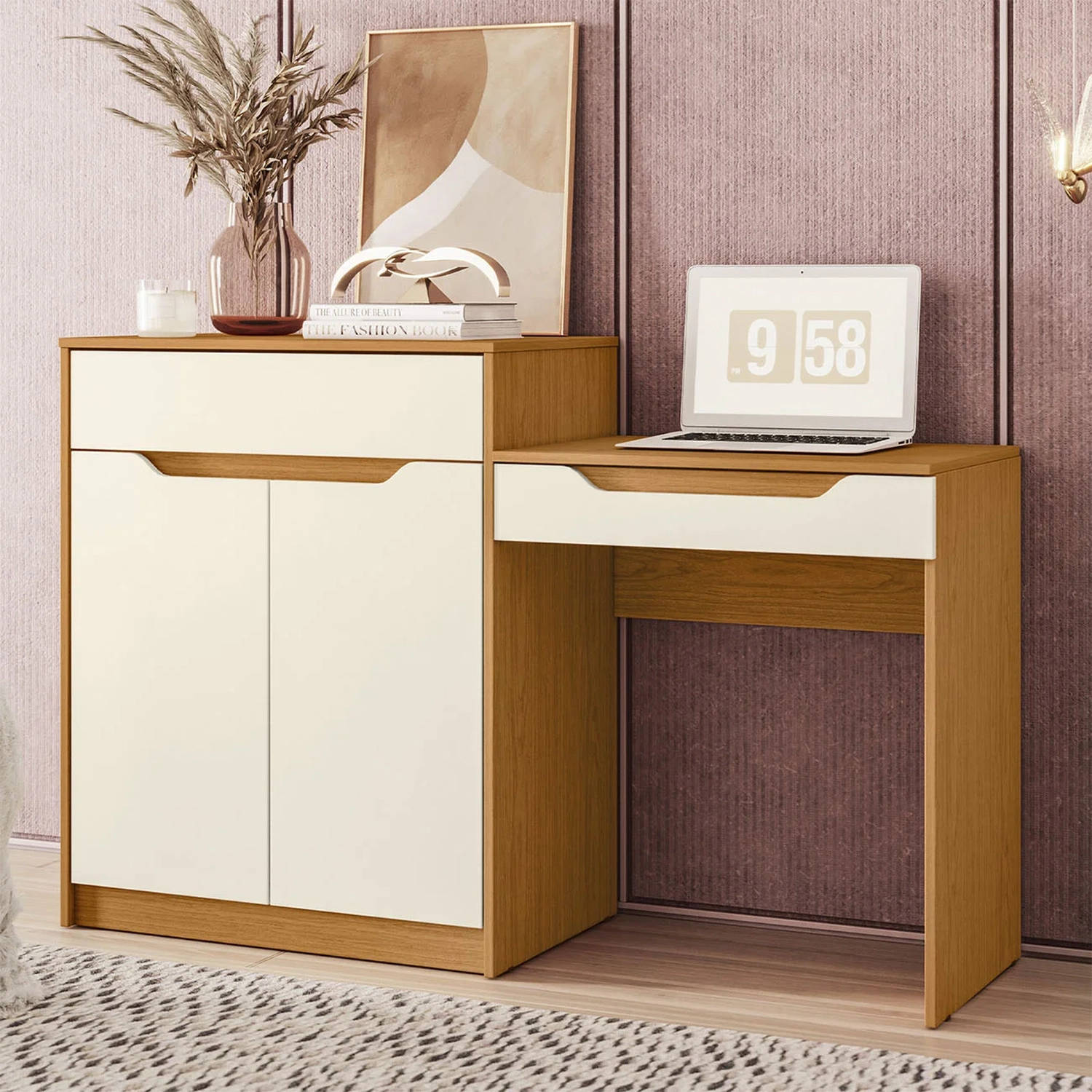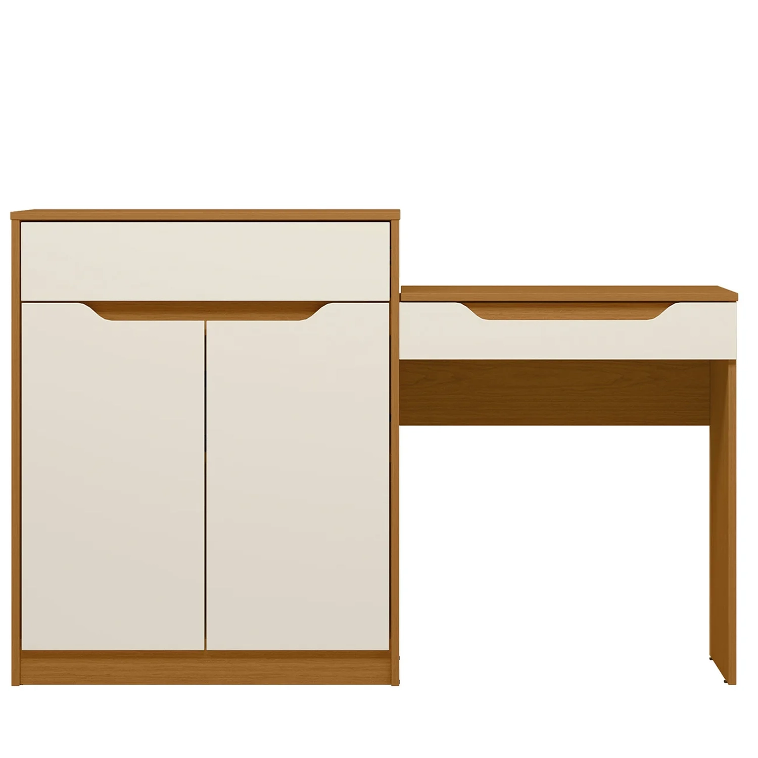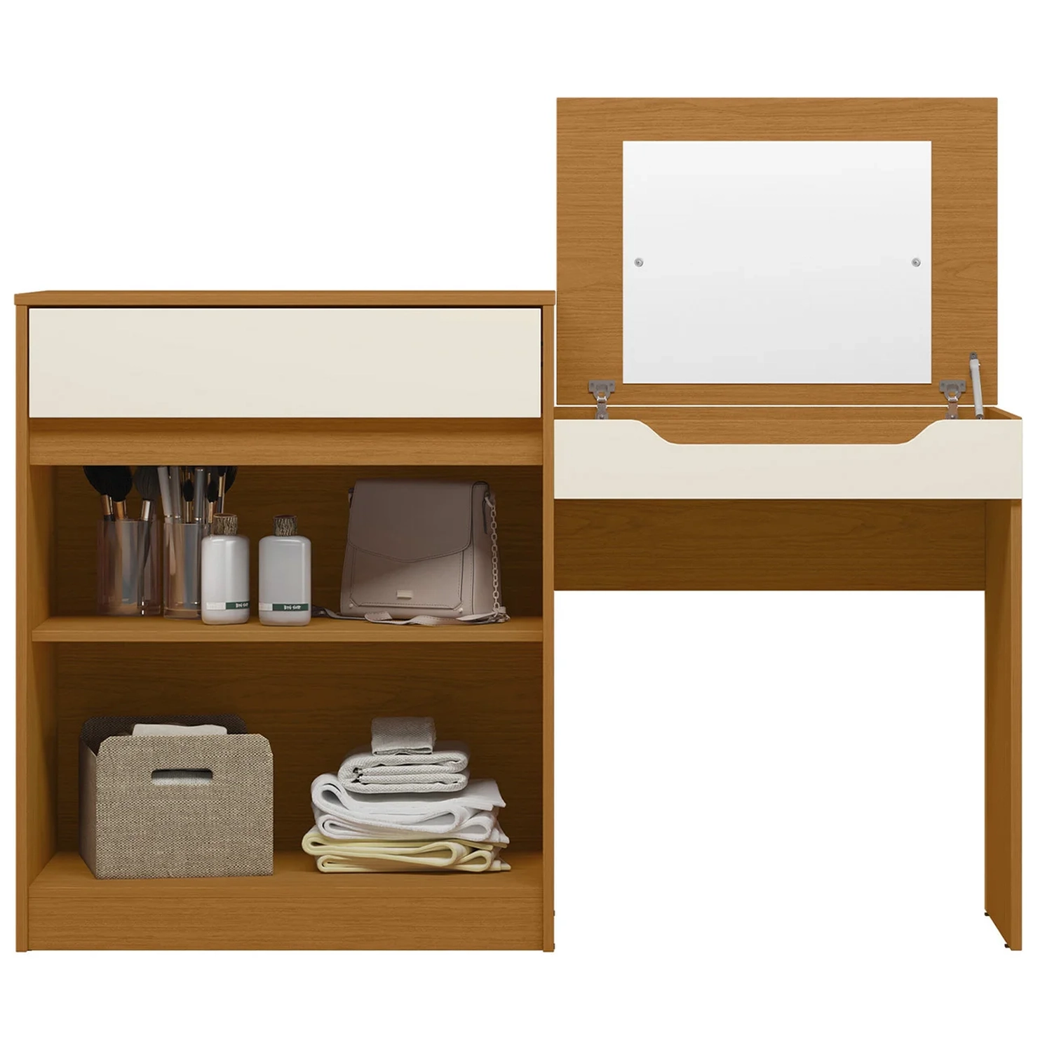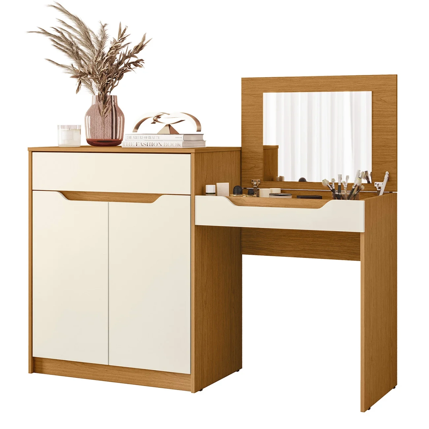 Essa Penteadeira Escrivaninha com Espelho Bent A02 Off/Cinamomo, da Mpozenato é a combinação perfeita entre funcionalidade, estilo e organização para o seu Quarto.
