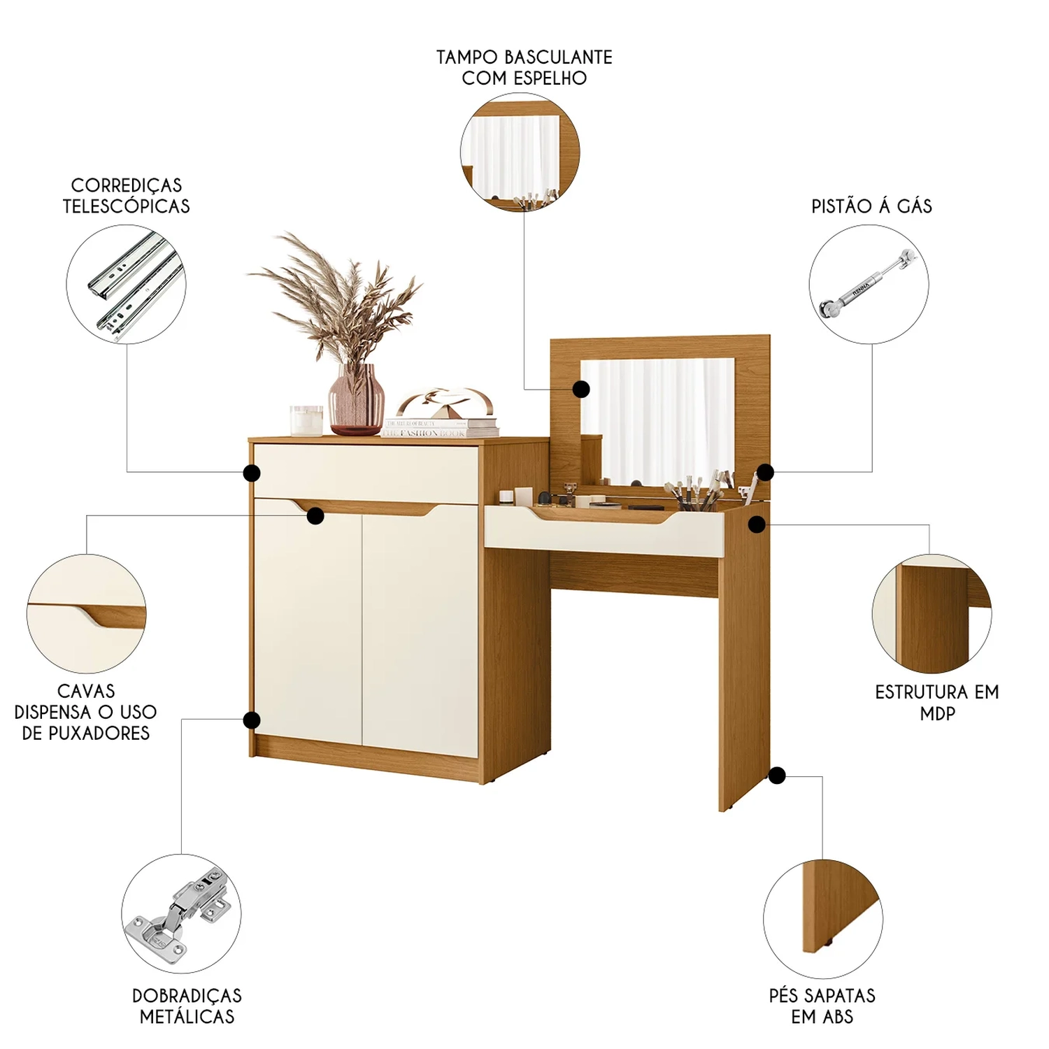 Com um design moderno e sofisticado, a Penteadeira traz um tampo basculante com espelho interno, que oferece praticidade e um toque de elegância. O sistema de pistão a gás garante um movimento suave e seguro ao abrir o espelho, proporcionando uma experiência de uso confortável. Além disso, as divisórias organizacionais internas possibilitam uma organização impecável dos seus produtos de beleza e itens pessoais, mantendo tudo no lugar com facilidade. A Escrivaninha é equipada com uma gaveta, que conta com corrediças telescópicas, garantindo um deslizamento perfeito e maior durabilidade. O puxador cava, com seu design clean e funcional, facilita a abertura da gaveta. O acabamento interno é 100% na cor do produto, proporcionando um visual harmonioso e sofisticado. Além de ser um item de decoração elegante, a Penteadeira Escrivaninha foi pensada para atender às necessidades de ergonomia, oferecendo uma altura ideal para o uso diário de forma confortável. Ideal para qualquer ambiente com sua presença refinada e seu excelente aproveitamento de espaço.
