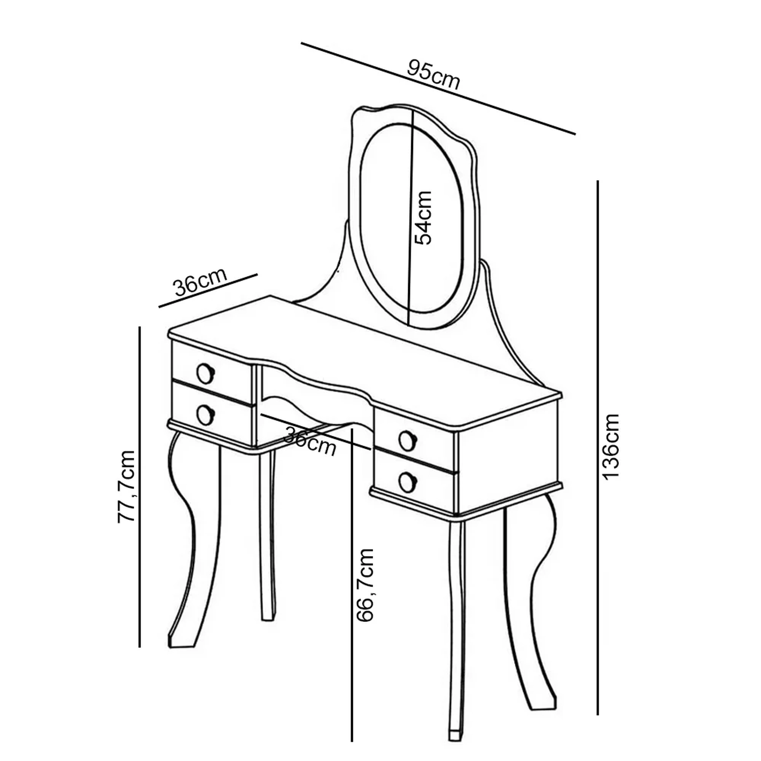 Penteadeira: 124 x 147 x 44,5 cm.