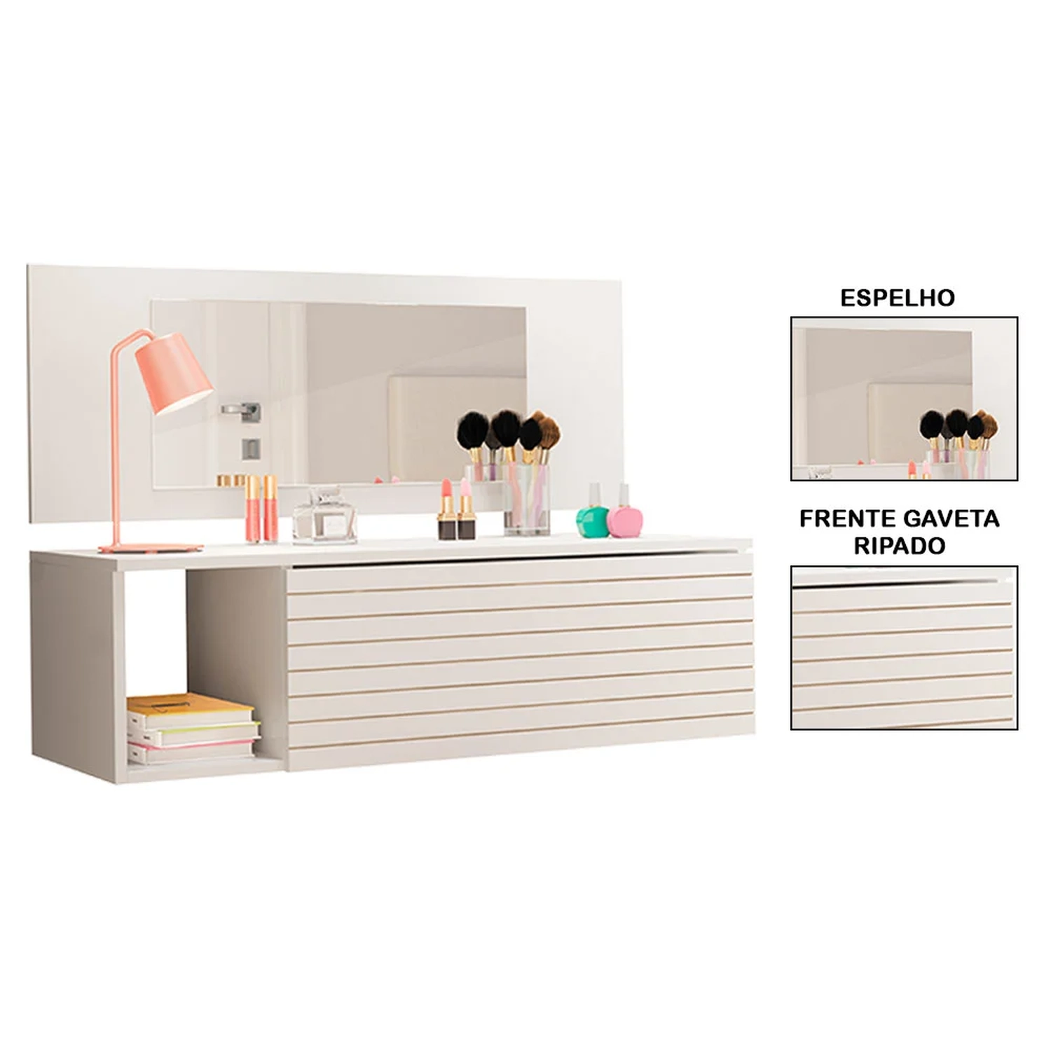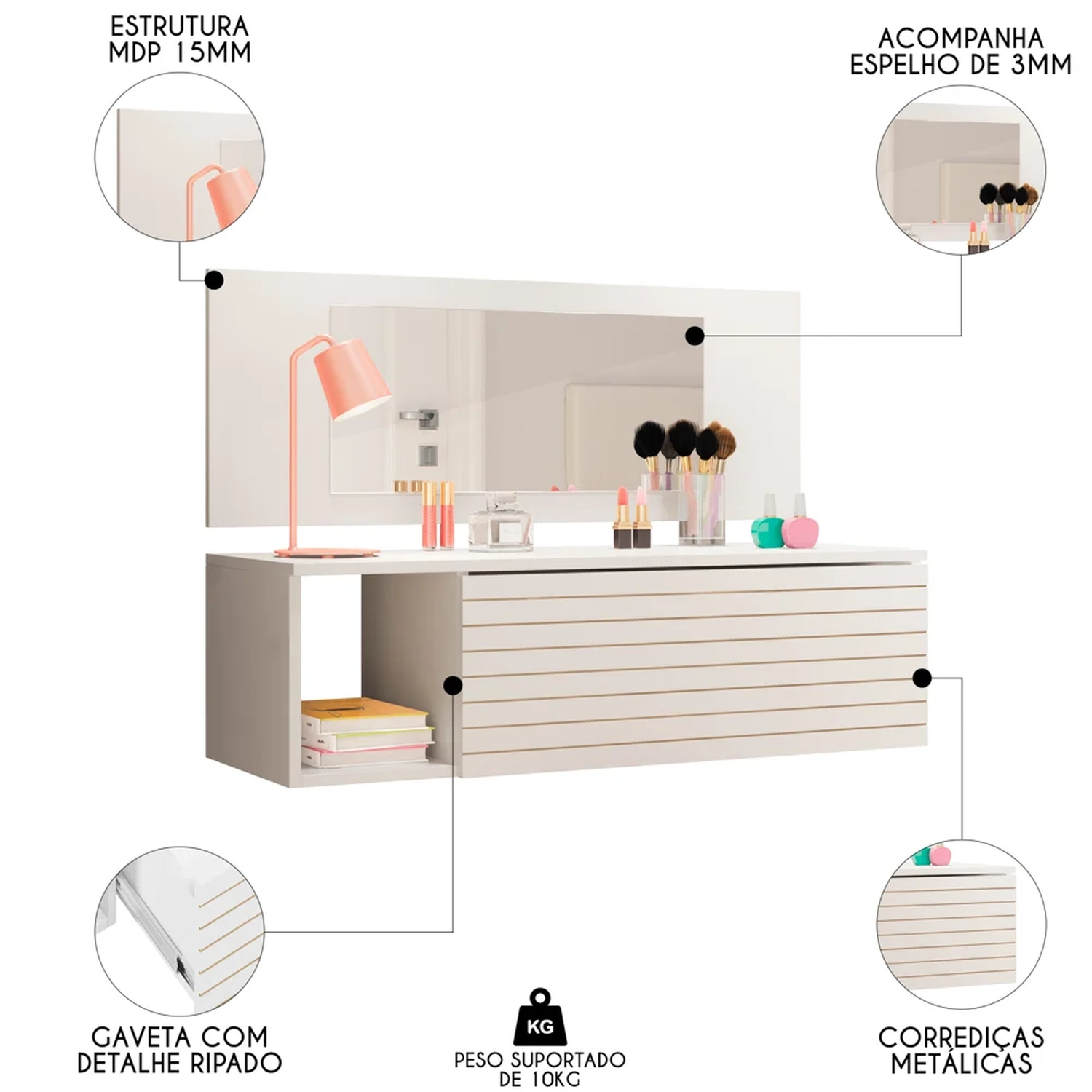 A Penteadeira Suspensa Joy, da Mpozenato, vai trazer estilo, elegância e organização para seu dormitório. Com um design moderno e seguindo tendências do mercado, como a gaveta com detalhe ripado e estrutura reforçada feita em MDP 15 mm com acabamento em BP, essa penteadeira com espelho deixará os seus momentos de cuidados muito mais agradáveis. Já as suas makes ficarão bem guardadas e protegidas na gaveta com corrediças metálicas e de quebra, você aproveita o nicho lateral para dispôr itens decorativos, deixando tudo com a sua cara.