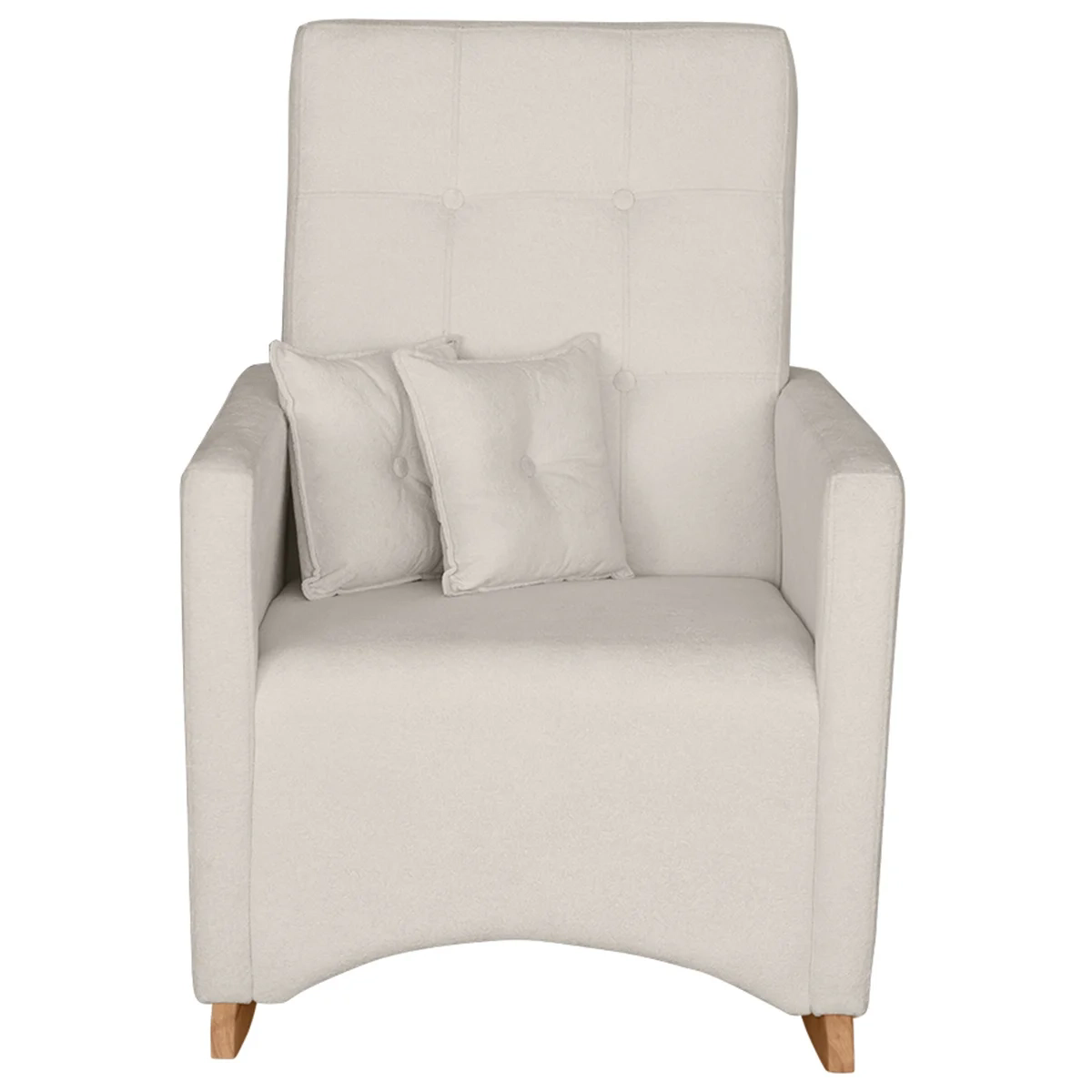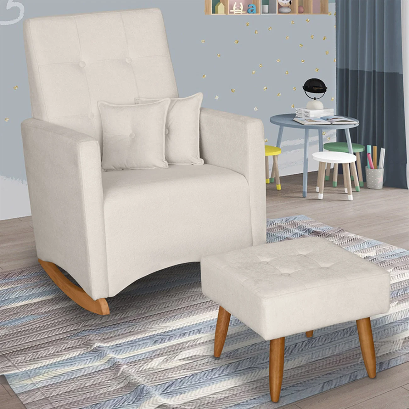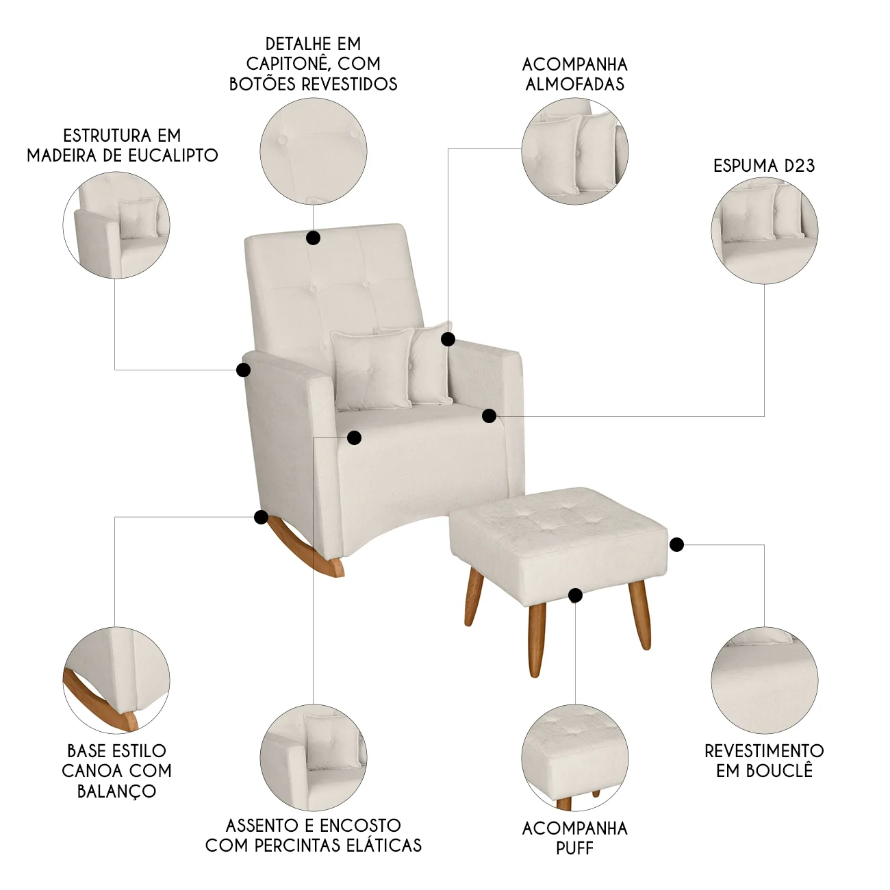 Com estrutura em madeira de eucalipto, oferece resistência e durabilidade no uso diário. A espuma D-23 combinada com o tecido bouclê da Poltrona proporciona um toque macio e agradável, excelente para longas períodos de amamentação. Seus pés de madeira contam com suporte estável e acabamento sofisticado, enquanto o mecanismo de balanço suaviza os movimentos, sendo perfeito para ninar o neném, promovendo relaxamento e bem-estar. O assento e o encosto são sustentados por percintas elásticas, garantindo firmeza e apoio adequados. O Puff incluso é ótimo para descansar os pés e aumentar ainda mais o conforto. Perfeita para quem busca praticidade e estilo, essa Poltrona de Amamentação se adapta facilmente a qualquer ambiente, seja no Quarto de bebê, na Sala de Estar ou em outros espaços, trazendo elegância e aconchego.
