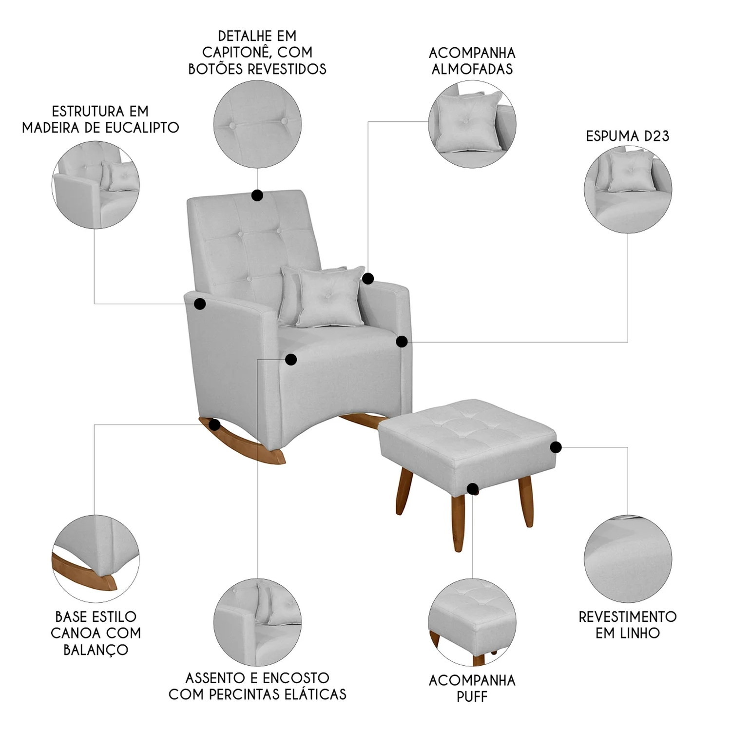 Com estrutura em madeira de eucalipto, oferece resistência e durabilidade no uso diário. A espuma D-23 combinada com o tecido linho da Poltrona proporciona um toque macio e agradável, excelente para longas períodos de amamentação. Seus pés de madeira contam com suporte estável e acabamento sofisticado, enquanto o mecanismo de balanço suaviza os movimentos, sendo perfeito para ninar o neném, promovendo relaxamento e bem-estar. O assento e o encosto são sustentados por percintas elásticas, garantindo firmeza e apoio adequados. O Puff incluso é ótimo para descansar os pés e aumentar ainda mais o conforto. Perfeita para quem busca praticidade e estilo, essa Poltrona de Amamentação se adapta facilmente a qualquer ambiente, seja no Quarto de bebê, na Sala de Estar ou em outros espaços, trazendo elegância e aconchego.