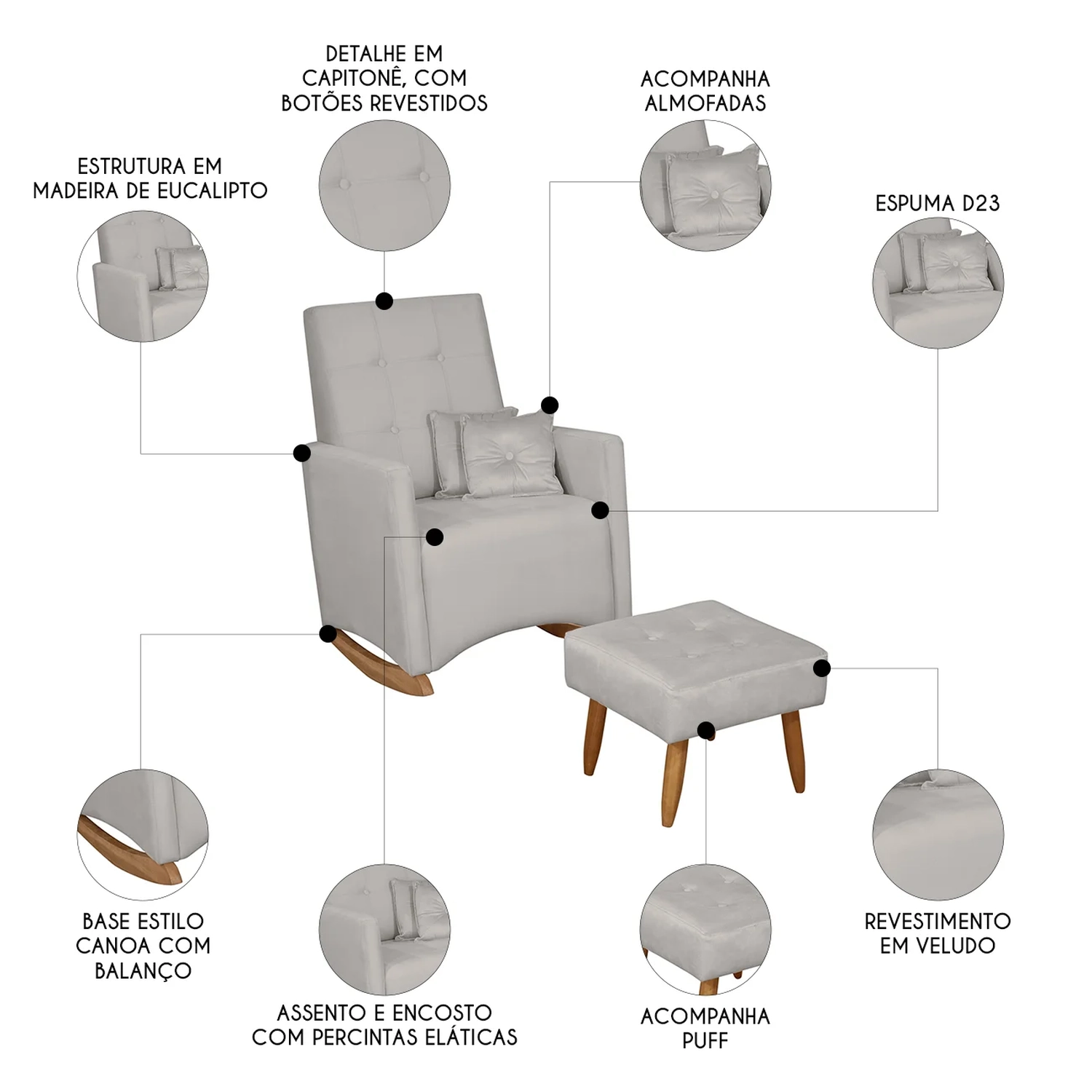 Com estrutura em madeira de eucalipto, oferece resistência e durabilidade no uso diário. A espuma D-23 combinada com o tecido veludo da Poltrona proporciona um toque macio e agradável, excelente para longas períodos de amamentação. Seus pés de madeira contam com suporte estável e acabamento sofisticado, enquanto o mecanismo de balanço suaviza os movimentos, sendo perfeito para ninar o neném, promovendo relaxamento e bem-estar. O assento e o encosto são sustentados por percintas elásticas, garantindo firmeza e apoio adequados. O Puff incluso é ótimo para descansar os pés e aumentar ainda mais o conforto. Perfeita para quem busca praticidade e estilo, essa Poltrona de Amamentação se adapta facilmente a qualquer ambiente, seja no Quarto de bebê, na Sala de Estar ou em outros espaços, trazendo elegância e aconchego.