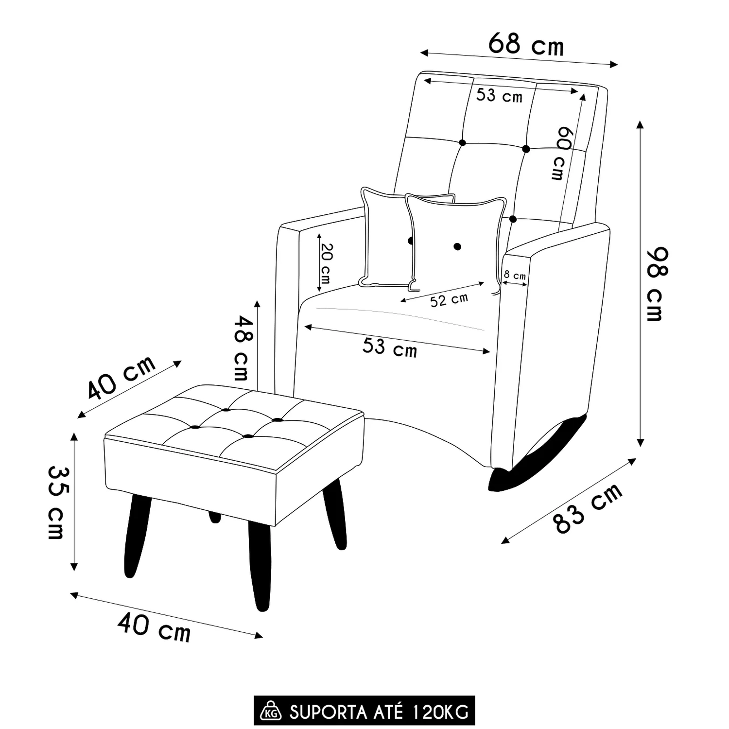 Poltrona: 68 x 98 x 83 cm.