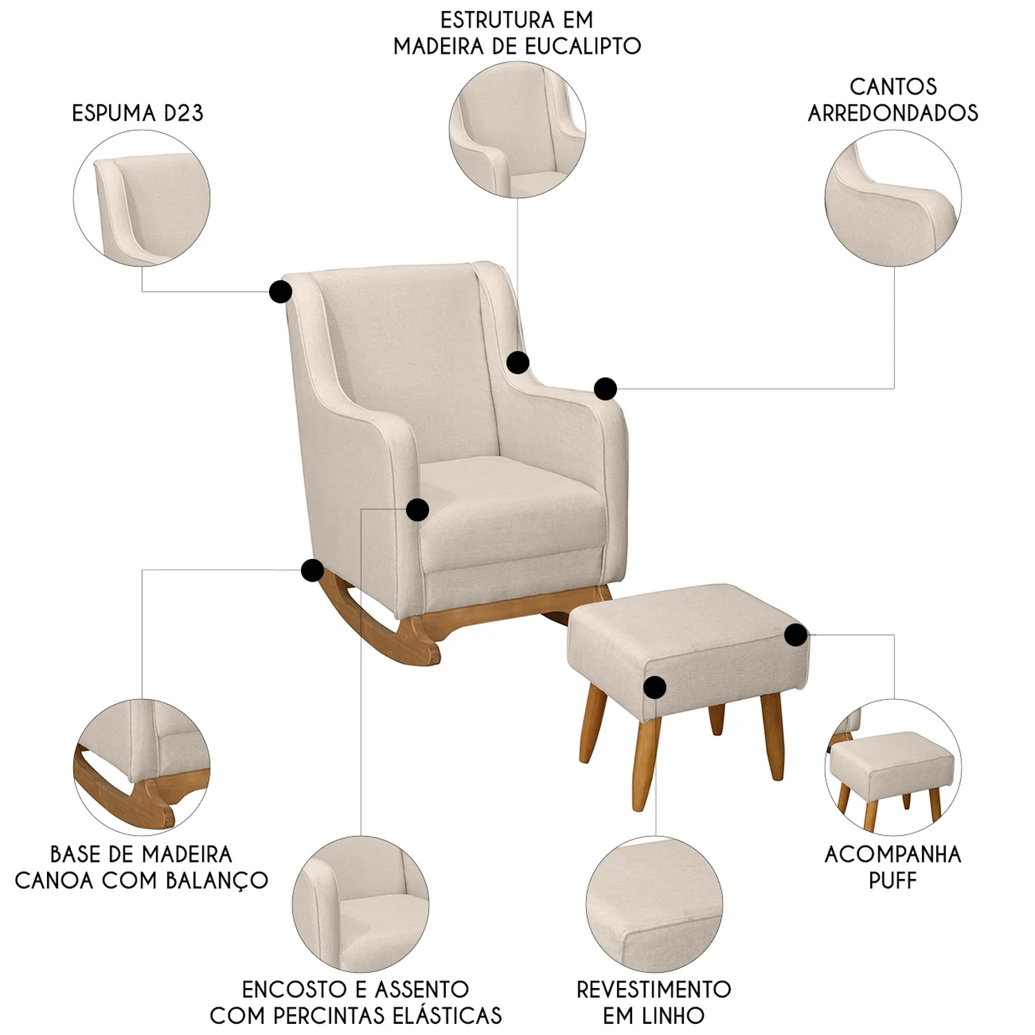 Com estrutura em madeira de eucalipto, oferece resistência e durabilidade no uso diário. A espuma D-23 combinada com o tecido linho da Poltrona proporciona um toque macio e agradável, excelente para longas períodos de amamentação. Seus pés de madeira contam com suporte estável e acabamento sofisticado, enquanto o mecanismo de balanço suaviza os movimentos, sendo perfeito para ninar o neném, promovendo relaxamento e bem-estar. O assento e o encosto são sustentados por percintas elásticas, garantindo firmeza e apoio adequados. O Puff incluso é ótimo para descansar os pés e aumentar ainda mais o conforto. Perfeita para quem busca praticidade e estilo, essa Poltrona de Amamentação se adapta facilmente a qualquer ambiente, seja no Quarto de bebê, na Sala de Estar ou em outros espaços, trazendo elegância e aconchego.