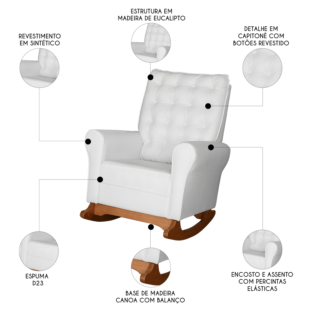 Com estrutura em madeira de eucalipto, oferece resistência e durabilidade no uso diário. A espuma D-23 combinada com o tecido sintético da Poltrona proporciona um toque macio e agradável, excelente para longas períodos de amamentação. Seus pés de madeira contam com suporte estável e acabamento sofisticado, enquanto o mecanismo de balanço suaviza os movimentos, sendo perfeito para ninar o neném, promovendo relaxamento e bem-estar. O assento e o encosto são sustentados por percintas elásticas, garantindo firmeza e apoio adequados. Perfeita para quem busca praticidade e estilo, essa Poltrona de Amamentação se adapta facilmente a qualquer ambiente, seja no Quarto de bebê, na Sala de Estar ou em outros espaços, trazendo elegância e aconchego.