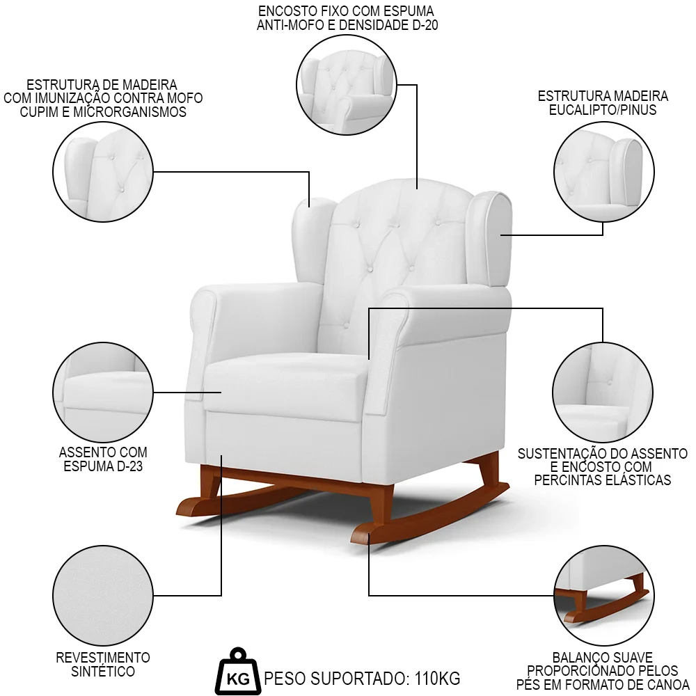 A Poltrona Amamentação Base Madeira Balanço e Puff Lucy Z39 Sintético Branco - Mpozenato é a escolha ideal para as mamães que buscam conforto, beleza e qualidade. Ela possui uma estrutura de madeira de reflorestamento com imunização contra mofo, cupim e microrganismos, garantindo maior durabilidade e resistência. Além disso, vem com um puff para apoiar os pés e relaxar. A sustentação do assento e encosto é feita com percintas elásticas que proporcionam mais maciez e ergonomia. O Tecido Sintético é fácil de limpar e tem um toque suave na pele. A base canoa com balanço permite um movimento suave e relaxante, ideal para ninar o bebê ou descansar após um dia cansativo. A poltrona tem um design moderno e elegante que combina com qualquer ambiente. Ela está disponível em várias cores para você escolher a que mais combina com o seu estilo. Não perca essa oportunidade de ter uma Poltrona de Amamentação e Descanso na sua casa. Você vai se surpreender com o conforto e a qualidade dessa poltrona. Compre já!