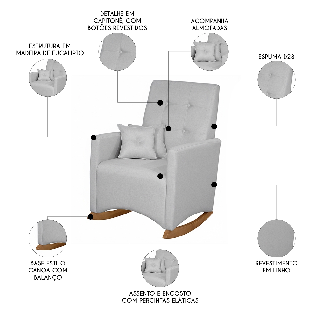 Com estrutura em madeira de eucalipto, oferece resistência e durabilidade no uso diário. A espuma D-23 combinada com o tecido linho da Poltrona proporciona um toque macio e agradável, excelente para longas períodos de amamentação. Seus pés de madeira contam com suporte estável e acabamento sofisticado, enquanto o mecanismo de balanço suaviza os movimentos, sendo perfeito para ninar o neném, promovendo relaxamento e bem-estar. O assento e o encosto são sustentados por percintas elásticas, garantindo firmeza e apoio adequados. Perfeita para quem busca praticidade e estilo, essa Poltrona de Amamentação se adapta facilmente a qualquer ambiente, seja no Quarto de bebê, na Sala de Estar ou em outros espaços, trazendo elegância e aconchego.