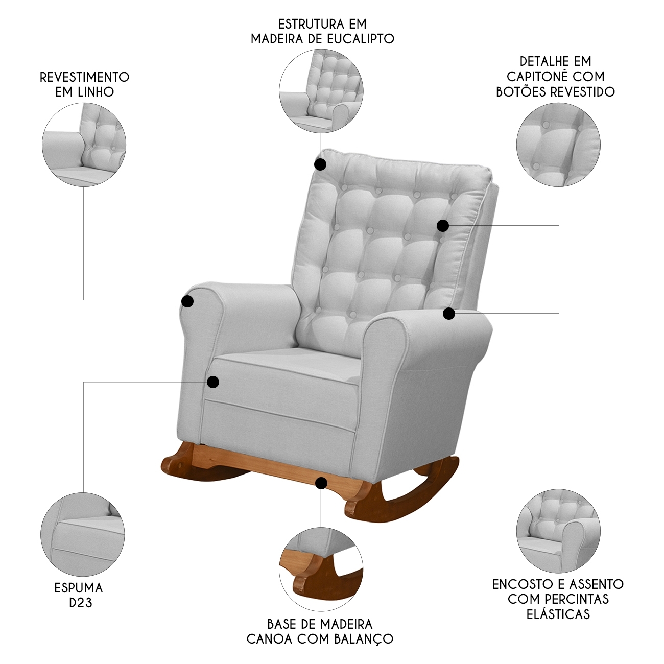Com estrutura em madeira de eucalipto, oferece resistência e durabilidade no uso diário. A espuma D-23 combinada com o tecido linho da Poltrona proporciona um toque macio e agradável, excelente para longas períodos de amamentação. Seus pés de madeira contam com suporte estável e acabamento sofisticado, enquanto o mecanismo de balanço suaviza os movimentos, sendo perfeito para ninar o neném, promovendo relaxamento e bem-estar. O assento e o encosto são sustentados por percintas elásticas, garantindo firmeza e apoio adequados. Perfeita para quem busca praticidade e estilo, essa Poltrona de Amamentação se adapta facilmente a qualquer ambiente, seja no Quarto de bebê, na Sala de Estar ou em outros espaços, trazendo elegância e aconchego.