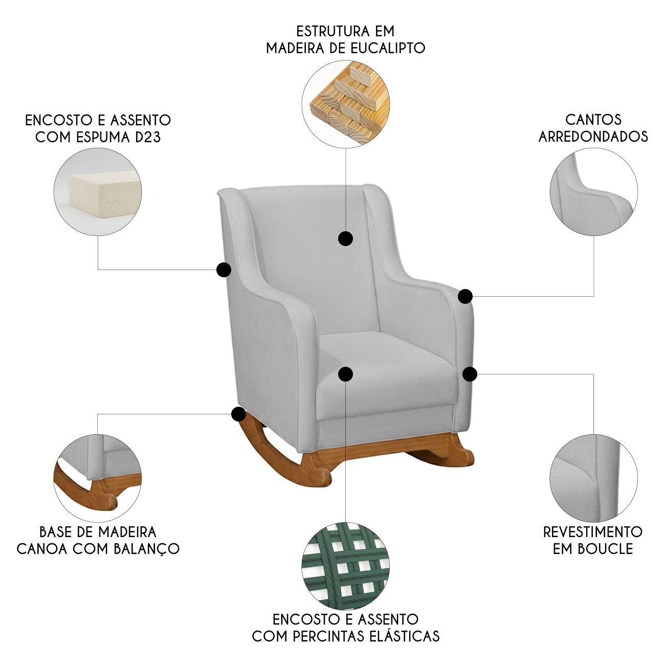 Com estrutura em madeira de eucalipto, oferece resistência e durabilidade no uso diário. A espuma D-23 combinada com o tecido bouclê da Poltrona proporciona um toque macio e agradável, excelente para longas períodos de amamentação. Seus pés de madeira contam com suporte estável e acabamento sofisticado, enquanto o mecanismo de balanço suaviza os movimentos, sendo perfeito para ninar o neném, promovendo relaxamento e bem-estar. O assento e o encosto são sustentados por percintas elásticas, garantindo firmeza e apoio adequados. Perfeita para quem busca praticidade e estilo, essa Poltrona de Amamentação se adapta facilmente a qualquer ambiente, seja no Quarto de bebê, na Sala de Estar ou em outros espaços, trazendo elegância e aconchego.