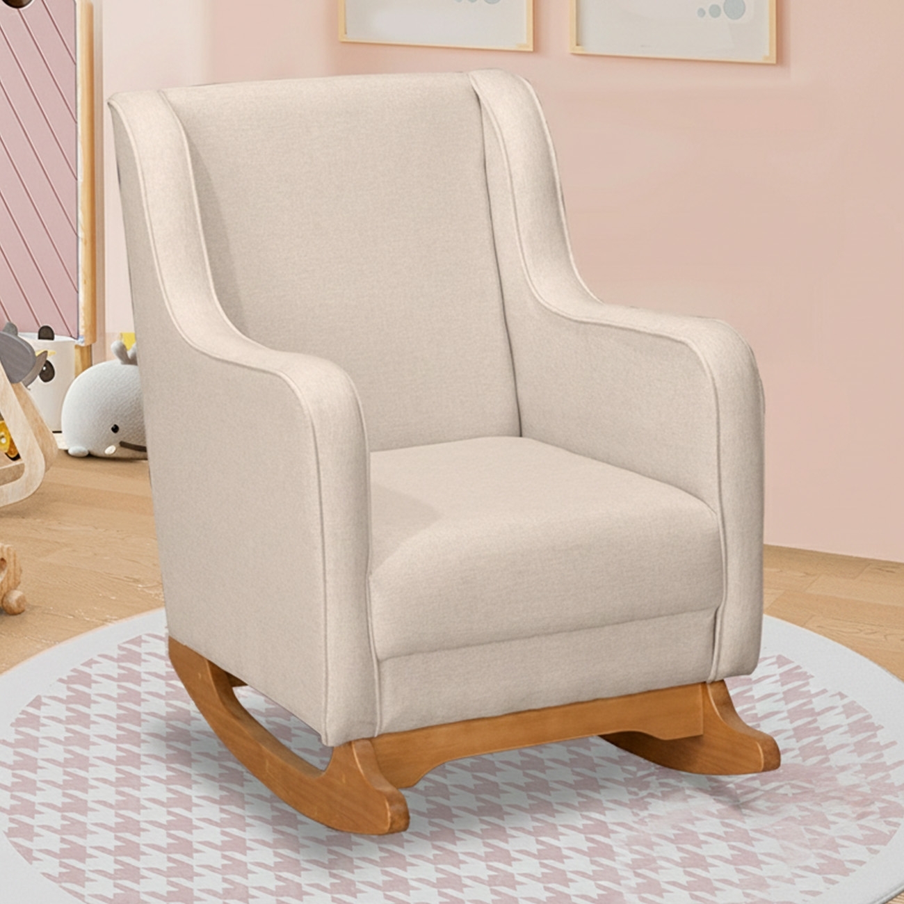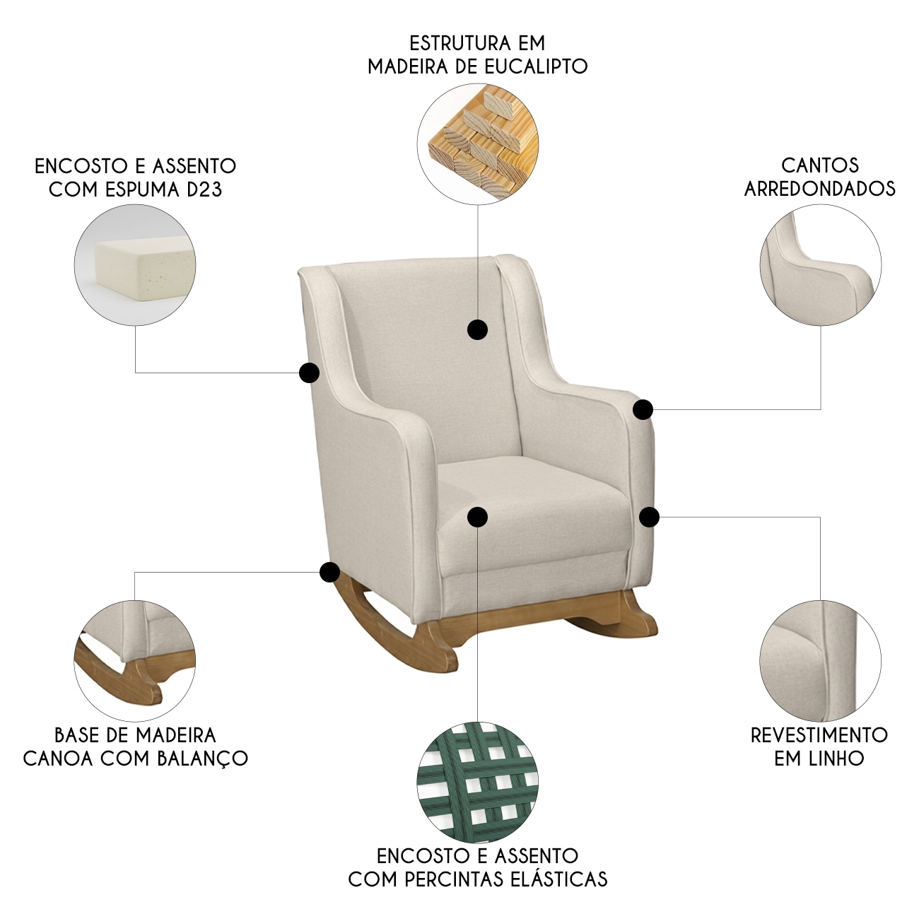 Com estrutura em madeira de eucalipto, oferece resistência e durabilidade no uso diário. A espuma D-23 combinada com o tecido linho da Poltrona proporciona um toque macio e agradável, excelente para longas períodos de amamentação. Seus pés de madeira contam com suporte estável e acabamento sofisticado, enquanto o mecanismo de balanço suaviza os movimentos, sendo perfeito para ninar o neném, promovendo relaxamento e bem-estar. O assento e o encosto são sustentados por percintas elásticas, garantindo firmeza e apoio adequados. Perfeita para quem busca praticidade e estilo, essa Poltrona de Amamentação se adapta facilmente a qualquer ambiente, seja no Quarto de bebê, na Sala de Estar ou em outros espaços, trazendo elegância e aconchego.