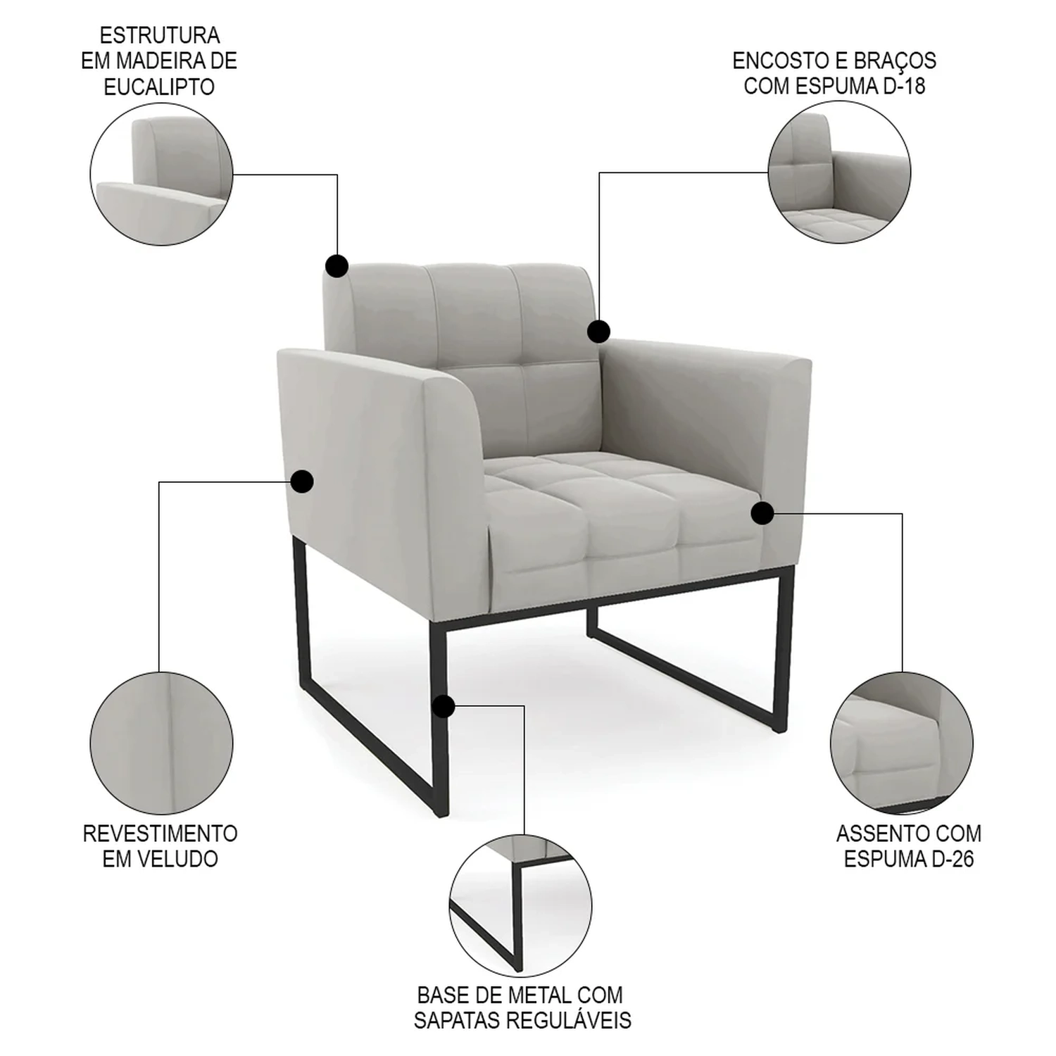 Você está procurando um Kit Poltrona que combine com a sua Sala De Estar, recepção ou seu quarto, que ofereça conforto e qualidade? Então você vai adorar a Poltrona Base Industrial Preto Kit 2 Ana Veludo Cinza, da Ibiza!
