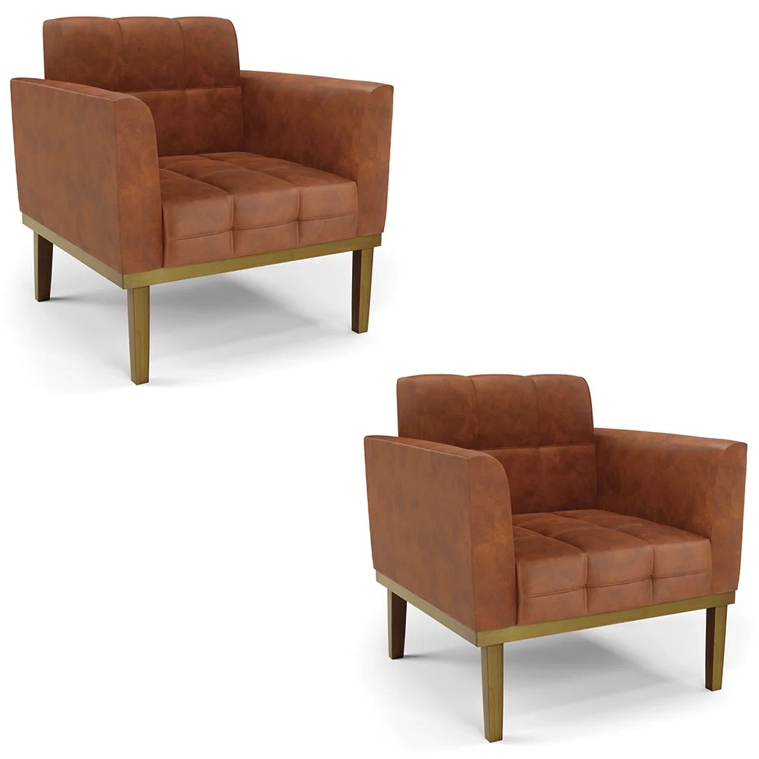 A Poltrona Decorativa é revestida em sintético PU, que é durável e fácil de limpar, e ainda valoriza o design da poltrona. Os braços e encosto são confortáveis em espuma D-18, já o assento é com espuma D-26 de alta densidade, que garante um assento firme e aconchegante, ideal para relaxar após um dia cansativo. A base em madeira de eucalipto é um charme à parte, que confere um toque Rústico e sofisticado à peça. São 2 poltronas com estrutura resistente que suporta até 120 kg cada. A montagem é muito simples, pois a poltrona já vem pronta, bastando apenas fixar a base com os parafusos que acompanham o produto. A limpeza também é muito prática, pois basta utilizar um pano limpo e levemente úmido, sem produtos abrasivos, para manter a sua poltrona sempre em bom estado. Sem dúvidas a Poltrona Para Sala vai transformar seu ambiente, deixando mais confortável e estiloso!