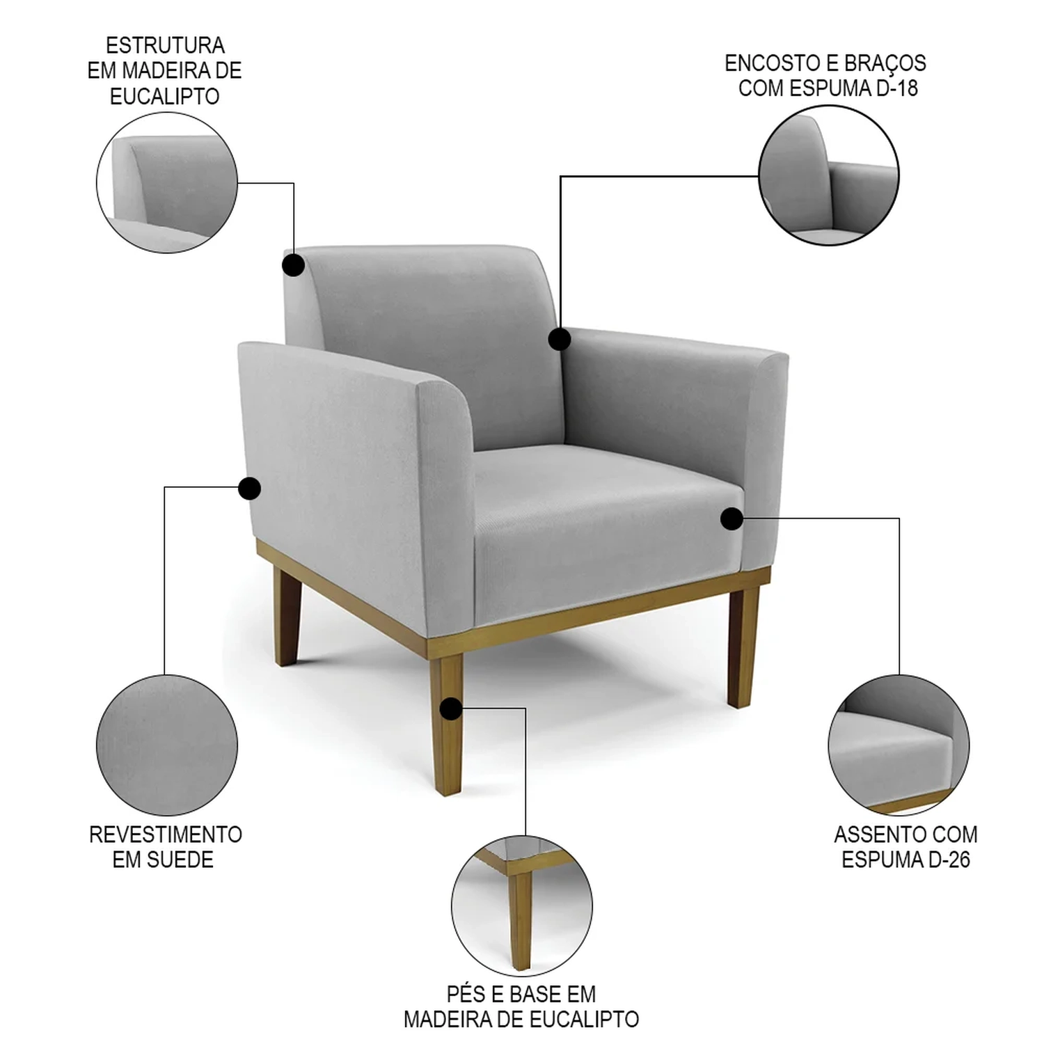 Material da Espuma: Assento D-26/ Encosto e braços D-18.