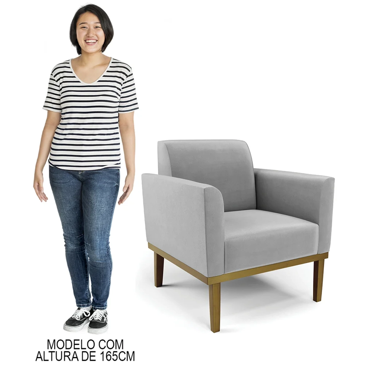 A Poltrona Decorativa é revestida em Suede, que é durável e fácil de limpar, e ainda valoriza o design da poltrona. Os braços e encosto são confortáveis em espuma D-18, já o assento é com espuma D-26 de alta densidade, que garante um assento firme e aconchegante, ideal para relaxar após um dia cansativo. A base em madeira de eucalipto é um charme à parte, que confere um toque Rústico e sofisticado à peça. São 2 poltronas com estrutura resistente que suporta até 120 kg cada. A montagem é muito simples, pois a poltrona já vem pronta, bastando apenas fixar a base com os parafusos que acompanham o produto. A limpeza também é muito prática, pois basta utilizar um pano limpo e levemente úmido, sem produtos abrasivos, para manter a sua poltrona sempre em bom estado. Sem dúvidas a Poltrona Para Sala vai transformar seu ambiente, deixando mais confortável e estiloso!