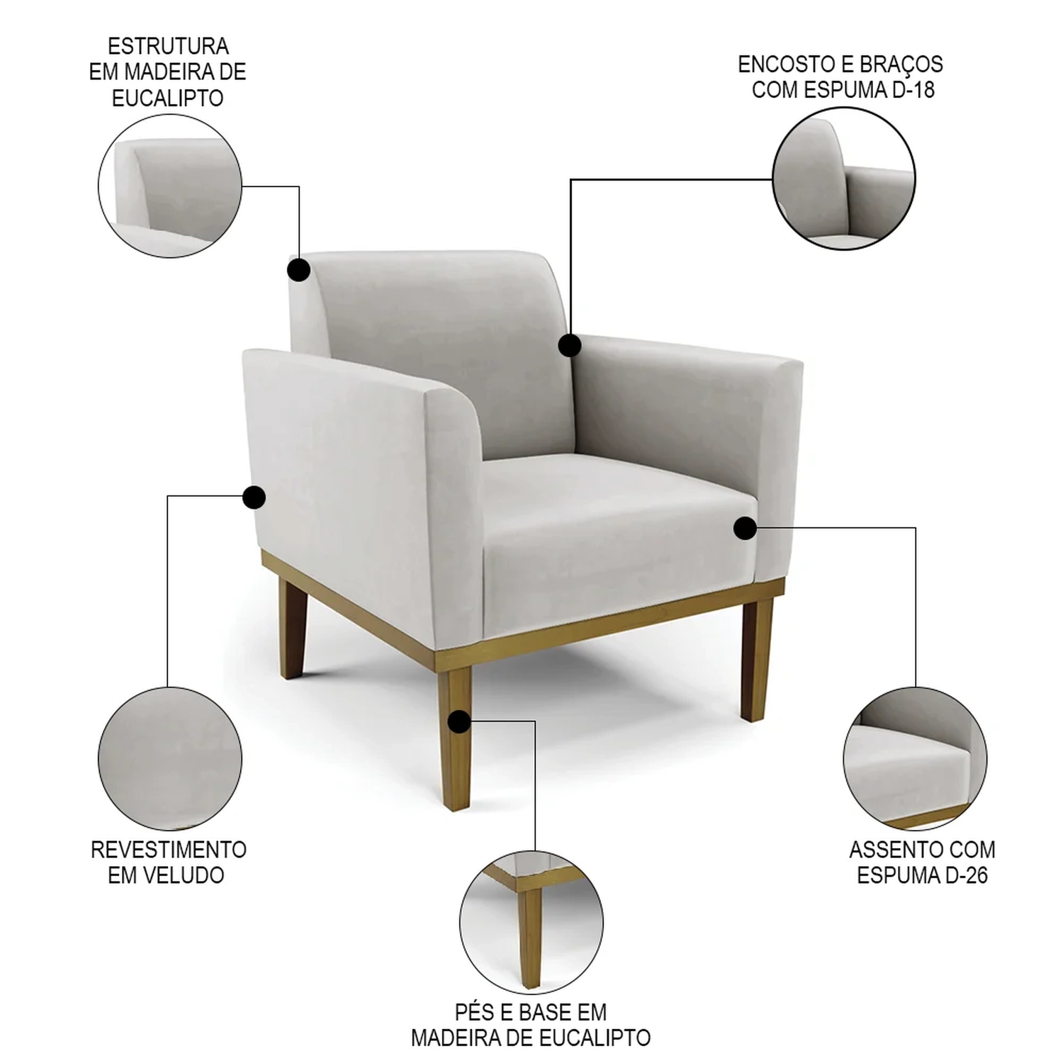 Material da Espuma: Assento D-26/ Encosto e braços D-18.