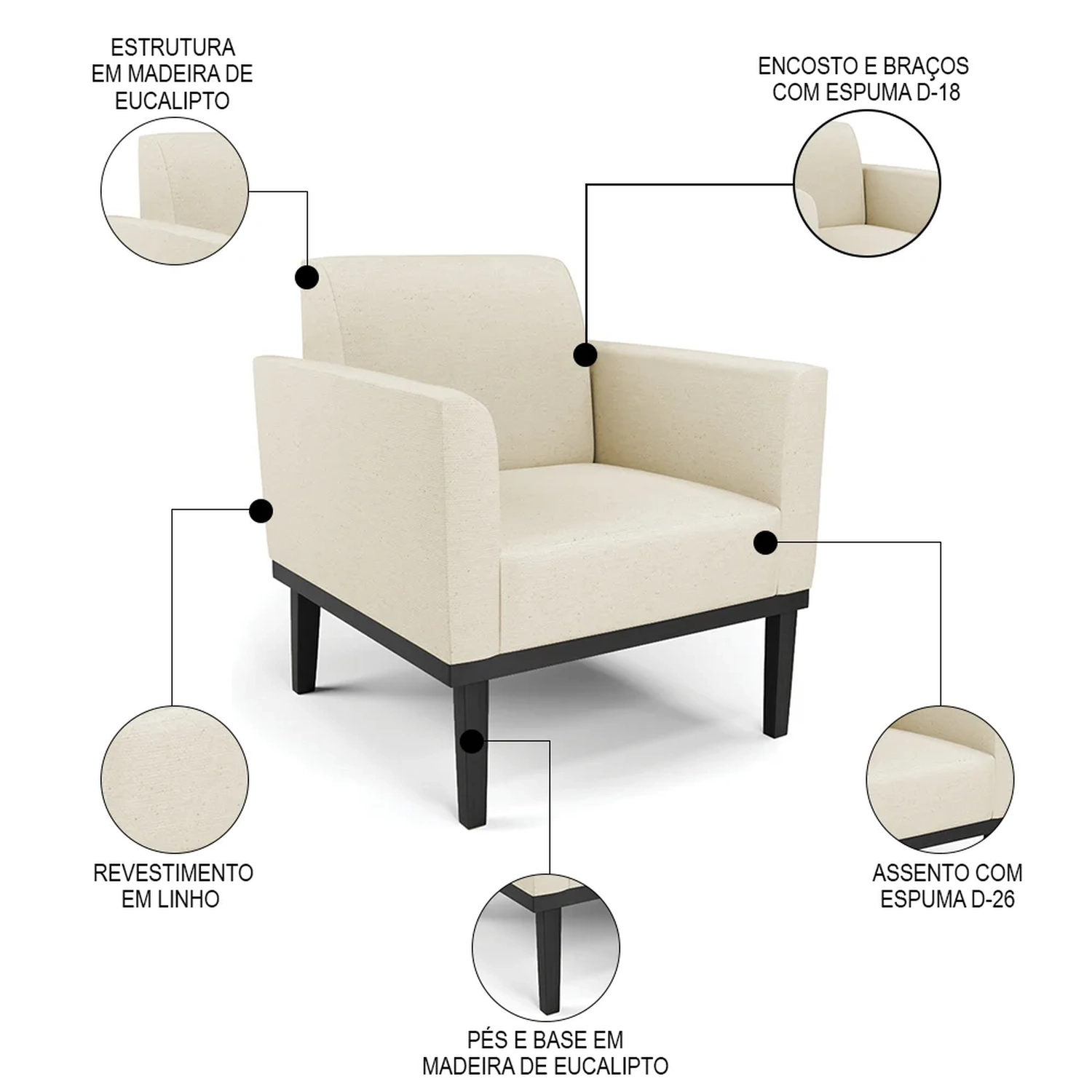 Material da Espuma: Assento D-26/ Encosto e braços D-18.