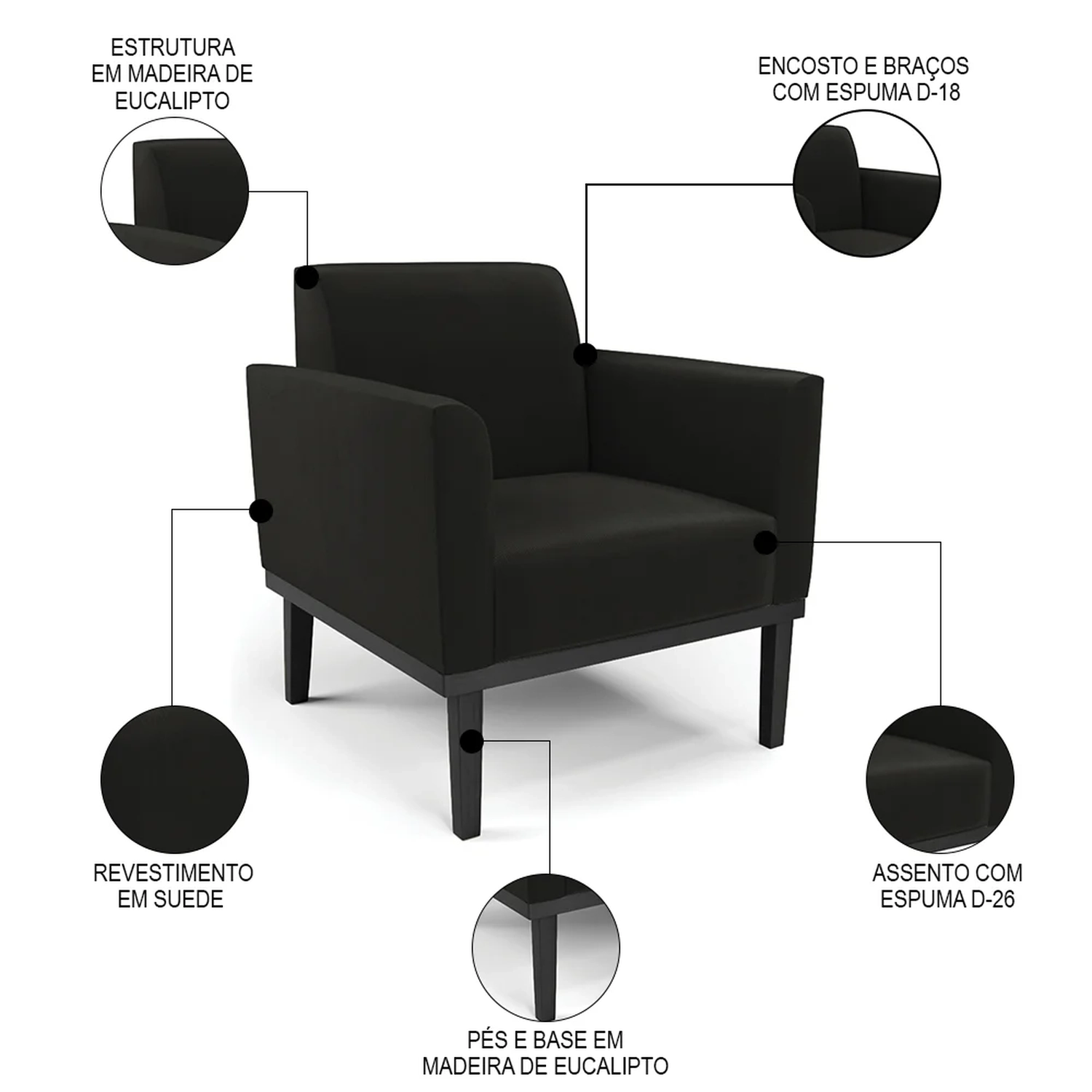 Você está procurando um Kit Poltrona que combine com a sua Sala De Estar, recepção ou seu quarto, que ofereça conforto e qualidade? Então você vai adorar a Poltrona Base Madeira Preto Kit 2 Maressa Suede Preto, da Ibiza!