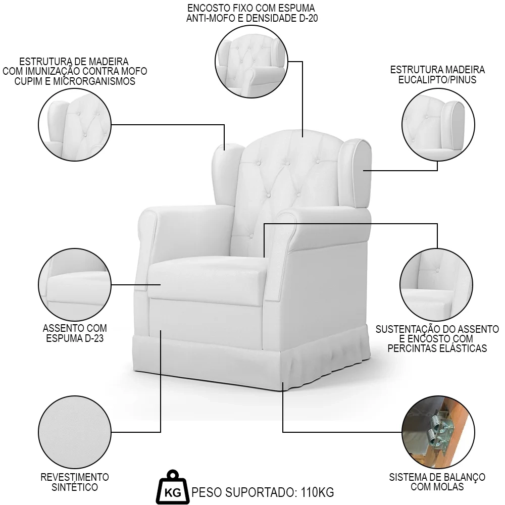 Peso Suportado: 3 kg por prateleira/110 Kg na Poltrona.