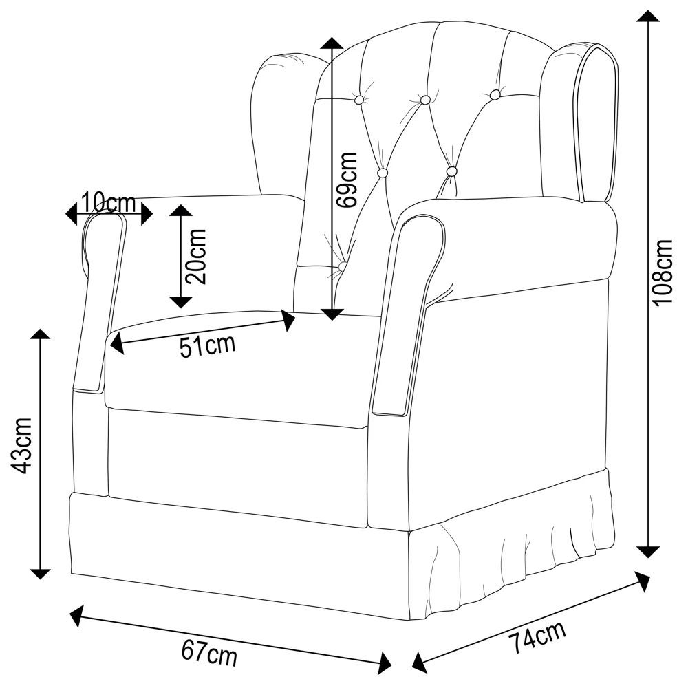 Poltrona: 67 x 108 x 74 cm.