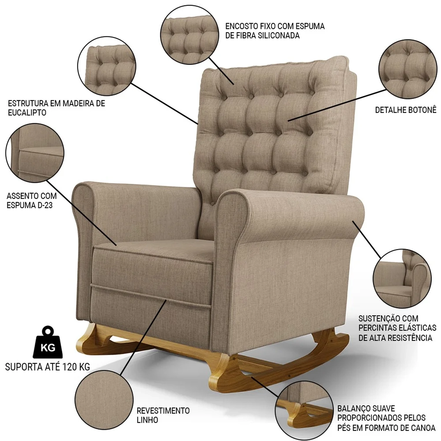 Uma Poltrona de Balanço feita com materiais de alta qualidade, estrutura em madeira de eucalipto, o tecido linho macio e resistente, e a espuma D23 a densidade ideal para o seu conforto, base em madeira com um lindo design e balanço suave, que ajuda a relaxar e a embalar o sono do seu bebê. O Kit Poltrona e Puff possui um design moderno e sofisticado, com detalhes em botonê revestido no encosto, que dão um toque de charme e elegância ao ambiente. A Poltrona de Amamentação também acompanha um puff pés madeira tecido linho, que serve como apoio para os pés ou como assento extra. O puff tem o mesmo acabamento da poltrona, criando um conjunto harmonioso e bonito.