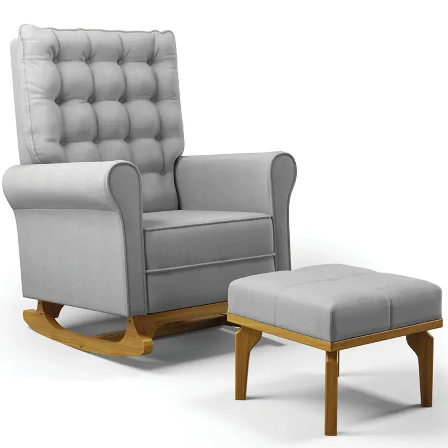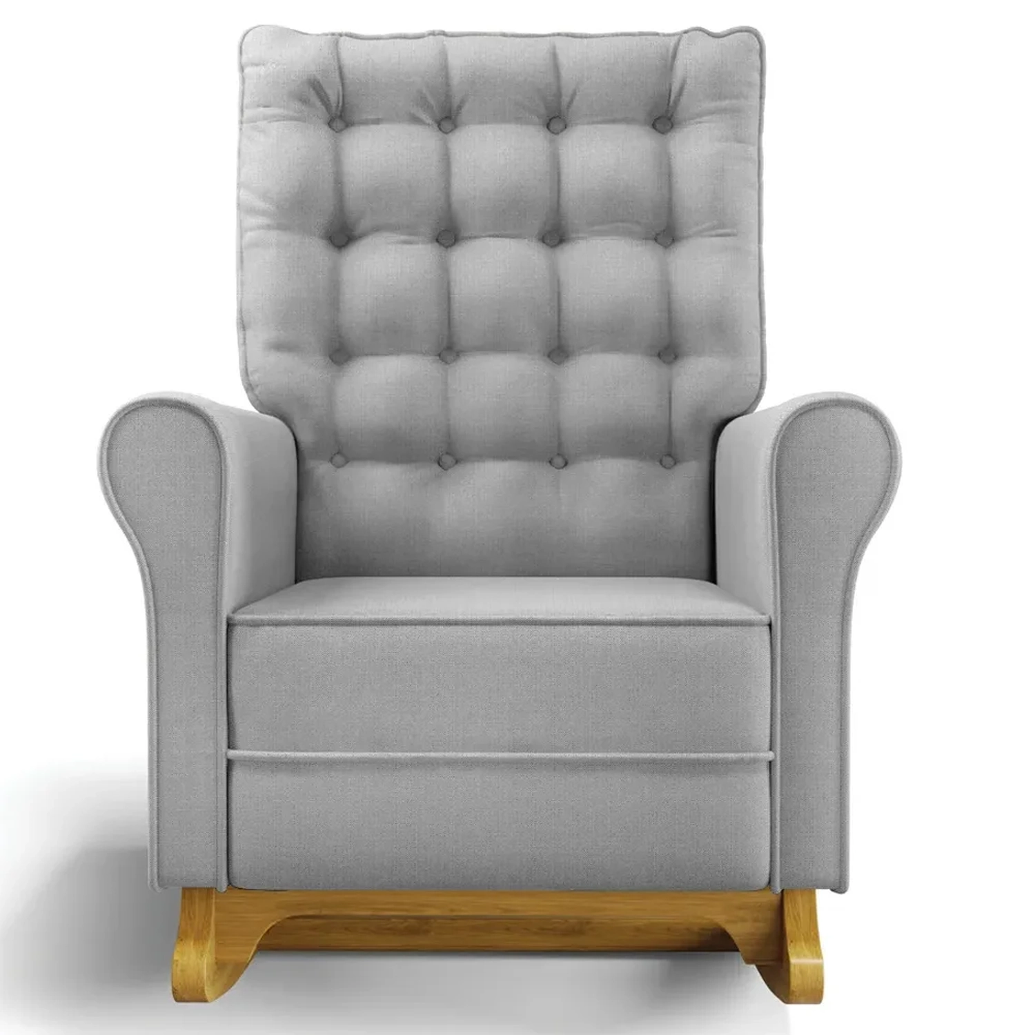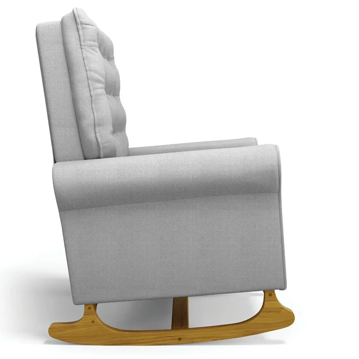 Uma Poltrona de Balanço feita com materiais de alta qualidade, estrutura em madeira de eucalipto, o tecido linho macio e resistente, e a espuma D23 a densidade ideal para o seu conforto, base em madeira com um lindo design e balanço suave, que ajuda a relaxar e a embalar o sono do seu bebê. O Kit Poltrona e Puff possui um design moderno e sofisticado, com detalhes em botonê revestido no encosto, que dão um toque de charme e elegância ao ambiente. A Poltrona de Amamentação também acompanha um puff pés madeira tecido linho, que serve como apoio para os pés ou como assento extra. O puff tem o mesmo acabamento da poltrona, criando um conjunto harmonioso e bonito.