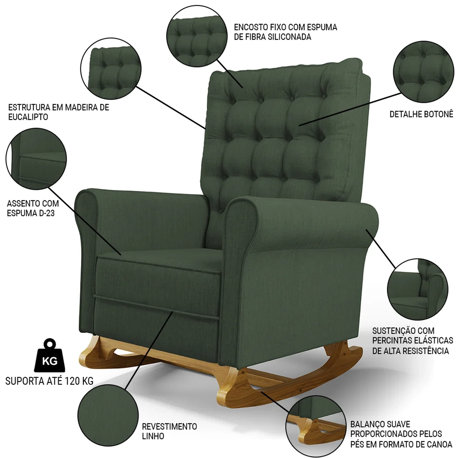Uma Poltrona de Balanço feita com materiais de alta qualidade, estrutura em madeira de eucalipto, o tecido linho macio e resistente, e a espuma D23 a densidade ideal para o seu conforto, base em madeira com um lindo design e balanço suave, que ajuda a relaxar e a embalar o sono do seu bebê. O Kit Poltrona e Puff possui um design moderno e sofisticado, com detalhes em botonê revestido no encosto, que dão um toque de charme e elegância ao ambiente. A Poltrona de Amamentação também acompanha um puff pés madeira tecido linho, que serve como apoio para os pés ou como assento extra. O puff tem o mesmo acabamento da poltrona, criando um conjunto harmonioso e bonito.