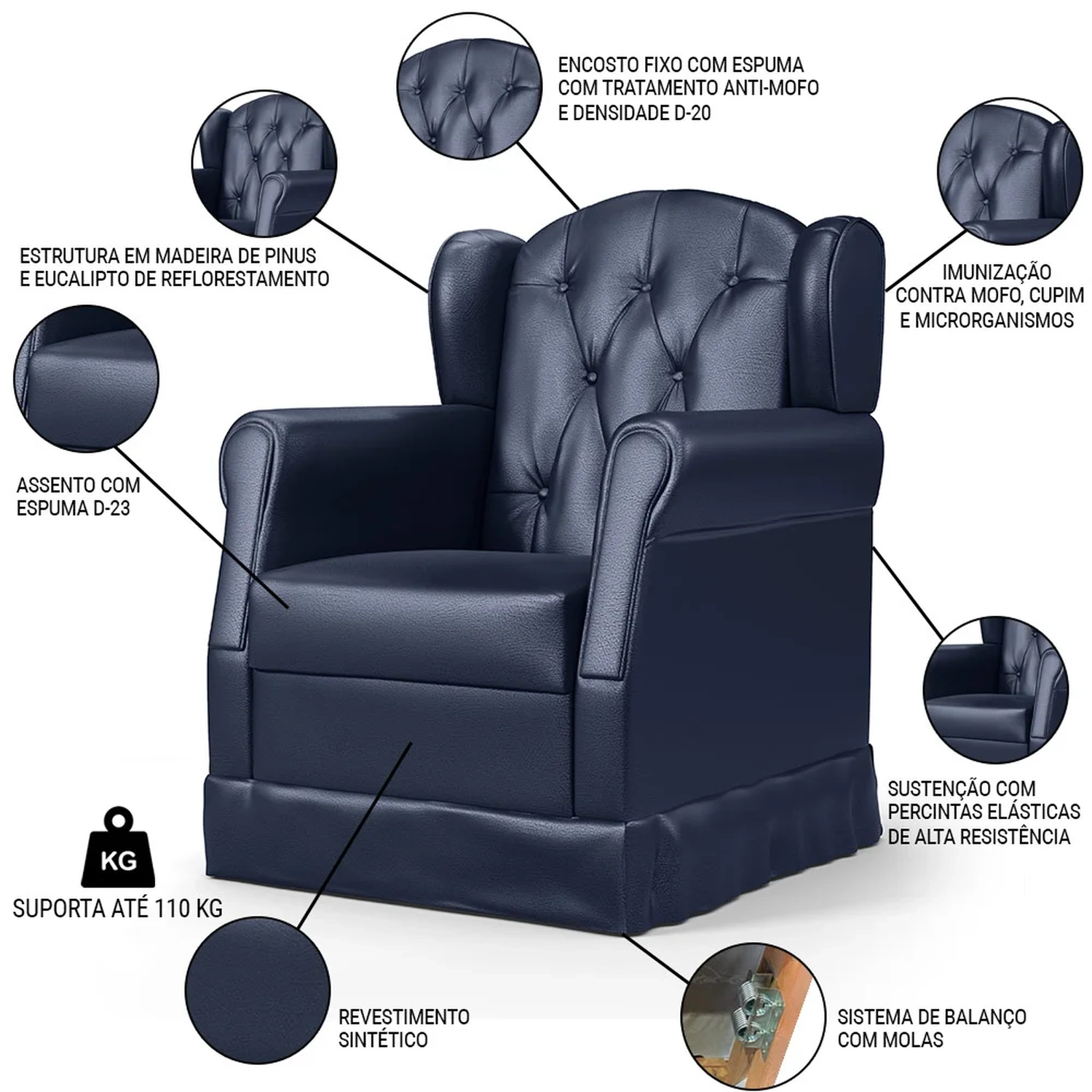 A Poltrona de Amamentação Balanço e Puff Lucy Z39 Sintético Azul Marinho - Mpozenato é ideal para as mamães que buscam conforto e praticidade na hora de cuidar do seu bebê. Ela é feita de Tecido Sintético, que é fácil de limpar e combina com qualquer ambiente. A estrutura é de madeira Eucalipto e Pinus de Reflorestamento imunizada contra mofo, cupim e microrganismos, garantindo durabilidade e segurança. O balanço proporciona um movimento suave e relaxante, enquanto o puff serve como apoio para os pés. A poltrona tem um design moderno e elegante, que vai deixar o seu quarto ou sala mais bonito e aconchegante. Disponível nas versões com Base Balanço e com Base Fixa, verifique as especificações do produto e adquira já a sua!