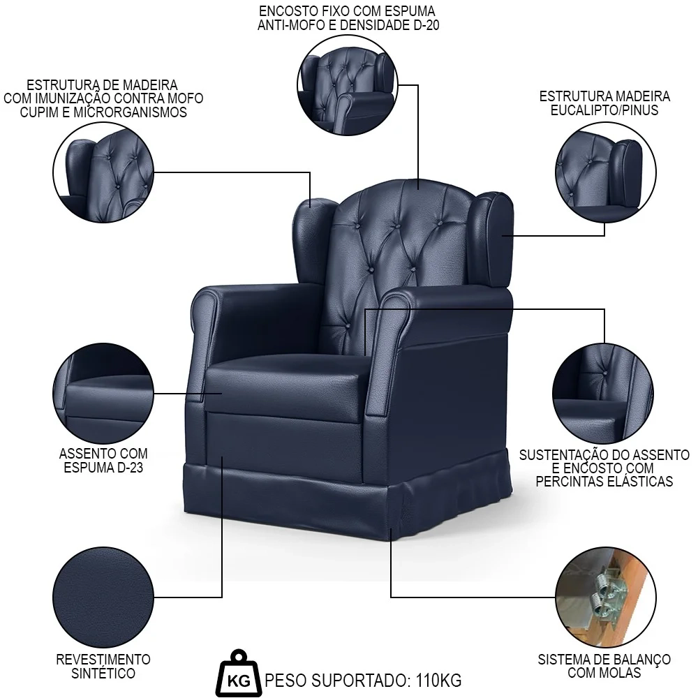 A Poltrona de Amamentação Balanço Lucy Z39 Sintético Azul Marinho - Mpozenato é um móvel que alia conforto e design. Fabricada em madeira de Eucalipto de Reflorestamento, ela possui uma estrutura resistente e durável. Sua espuma D-20 e D-23 proporciona um conforto extra para os momentos de descanso e amamentação. O Balanço é um diferencial que ajuda a relaxar e acalmar tanto a mãe quanto o bebê. Além disso, o revestimento Sintético é fácil de limpar e manter, tornando a poltrona ainda mais prática e funcional. Com a Poltrona Lucy, a mamãe terá um cantinho especial para cuidar do seu bebê com todo o conforto e estilo que deseja. Compre já!