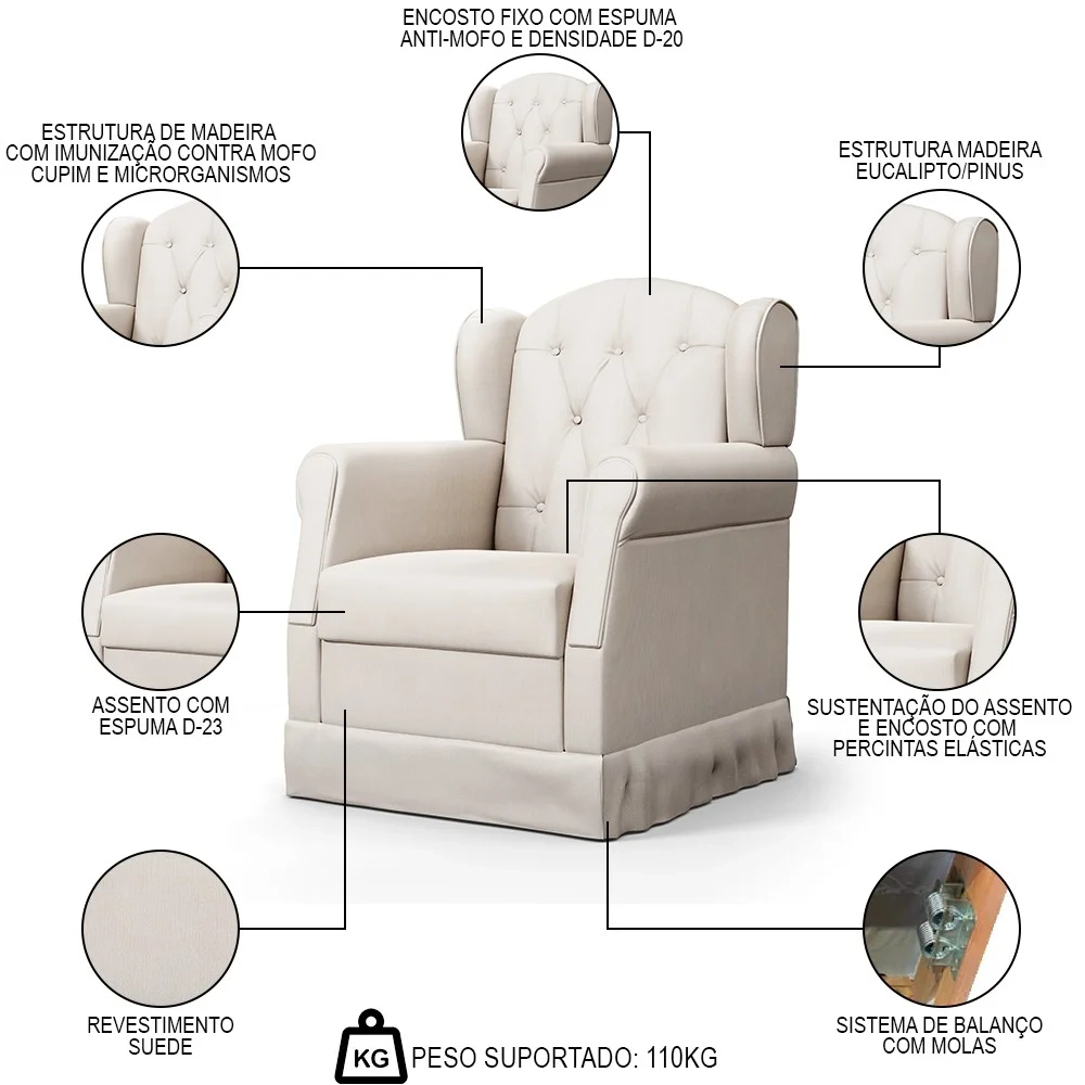 A Poltrona de Amamentação Balanço Lucy Z39 Suede Bege - Mpozenato é um móvel que alia conforto e design. Fabricada em madeira de Eucalipto de Reflorestamento, ela possui uma estrutura resistente e durável. Sua espuma D-20 e D-23 proporciona um conforto extra para os momentos de descanso e amamentação. O Balanço é um diferencial que ajuda a relaxar e acalmar tanto a mãe quanto o bebê. Além disso, o revestimento Suede é um tecido macio e agradável ao toque, que agrega modernidade e aconchego ao ambiente. Com a Poltrona Lucy, a mamãe terá um cantinho especial para cuidar do seu bebê com todo o conforto e estilo que deseja. Compre já!
