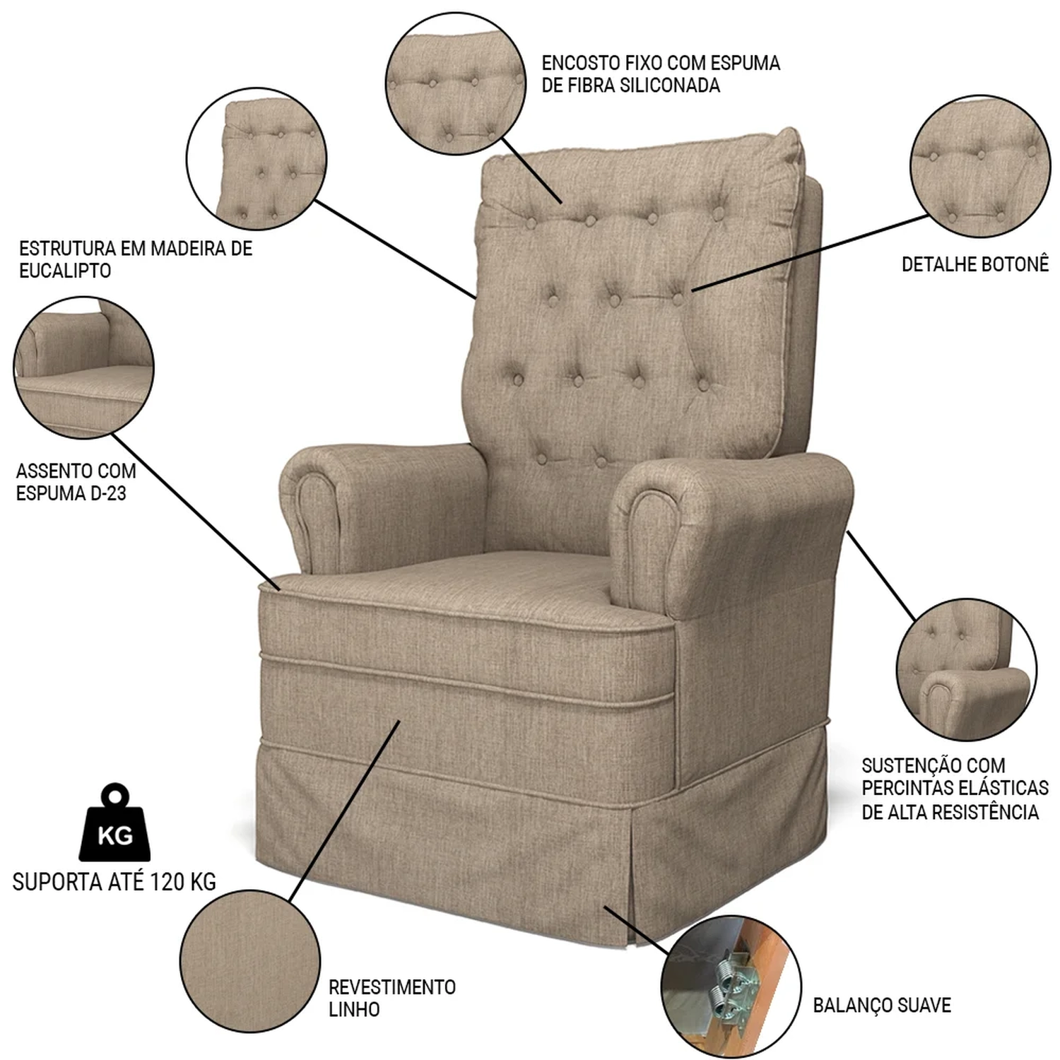 Uma Poltrona de Balanço feita com materiais de alta qualidade, estrutura em madeira de eucalipto, o tecido linho macio e resistente, e a espuma D23 a densidade ideal para o seu conforto, com um lindo design e balanço suave, que ajuda a relaxar e a embalar o sono do seu bebê. O Kit Poltrona e Puff possui um design moderno e sofisticado, com detalhes em botonê revestido no encosto, que dão um toque de charme e elegância ao ambiente. A Poltrona de Amamentação também acompanha um puff, que serve como apoio para os pés ou como assento extra. O puff tem o mesmo acabamento da poltrona, criando um conjunto harmonioso e bonito.