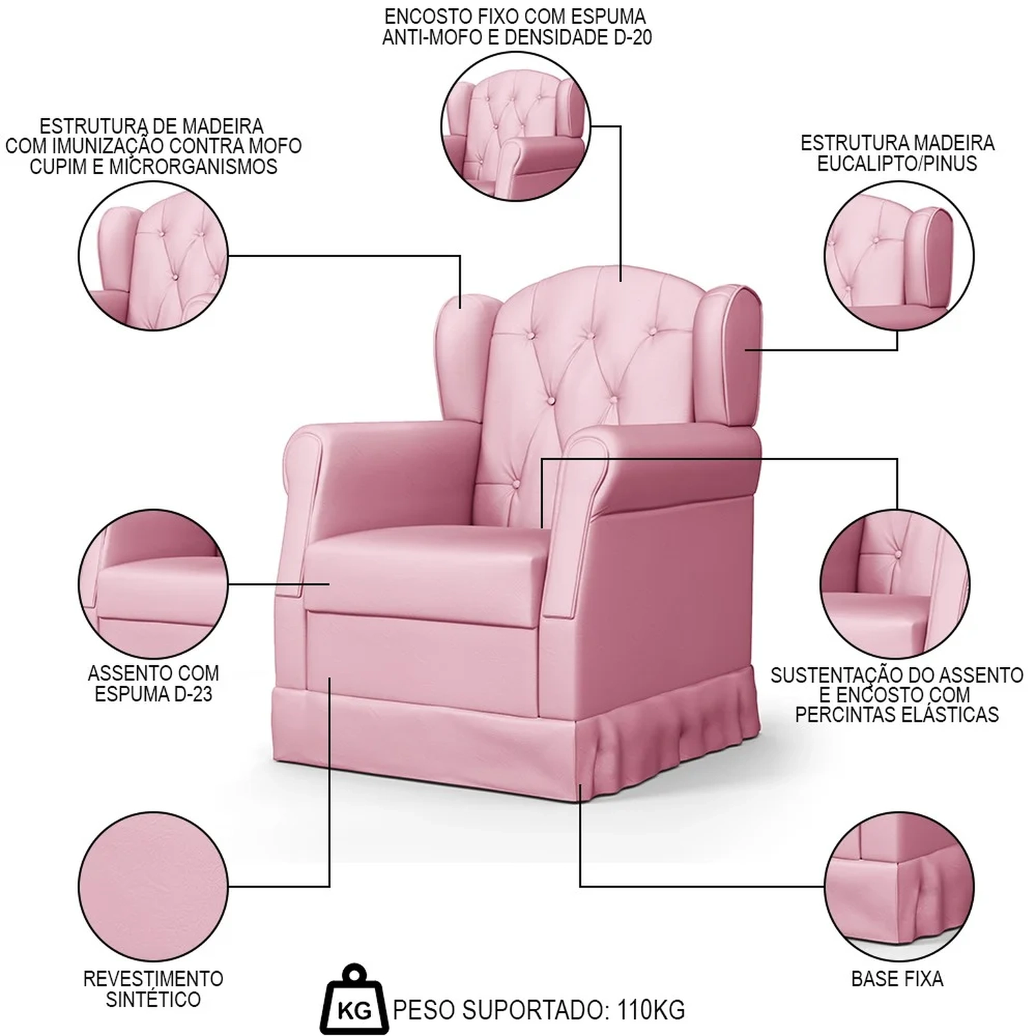 A Poltrona de Amamentação Fixa com Puff Letícia Sintético Rosa - Phoenix Baby é ideal para as mamães que buscam conforto e praticidade na hora de cuidar do seu bebê. Ela é feita de Tecido Sintético, que é fácil de limpar e combina com qualquer ambiente. A estrutura é de madeira Eucalipto e Pinus de Reflorestamento imunizada contra mofo, cupim e microrganismos, garantindo durabilidade e segurança. A Base Fixa tem uma estrutura firme, enquanto o puff serve como apoio para os pés. A poltrona tem um design moderno e elegante, que vai deixar o seu quarto ou sala mais bonito e aconchegante. Disponível nas versões com Base Fixa e com Base Balanço, verifique as especificações do produto e adquira já a sua!
