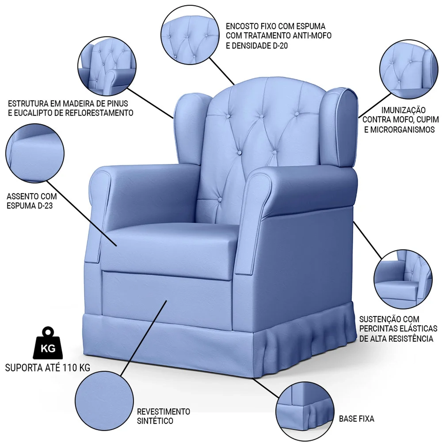 A Poltrona de Amamentação Fixa com Puff Lucy Z39 Sintético Azul - Mpozenato é ideal para as mamães que buscam conforto e praticidade na hora de cuidar do seu bebê. Ela é feita de Tecido Sintético, que é fácil de limpar e combina com qualquer ambiente. A estrutura é de madeira Eucalipto e Pinus de Reflorestamento imunizada contra mofo, cupim e microrganismos, garantindo durabilidade e segurança. A Base Fixa tem uma estrutura firme, enquanto o puff serve como apoio para os pés. A poltrona tem um design moderno e elegante, que vai deixar o seu quarto ou sala mais bonito e aconchegante. Disponível nas versões com Base Fixa e com Base Balanço, verifique as especificações do produto e adquira já a sua!