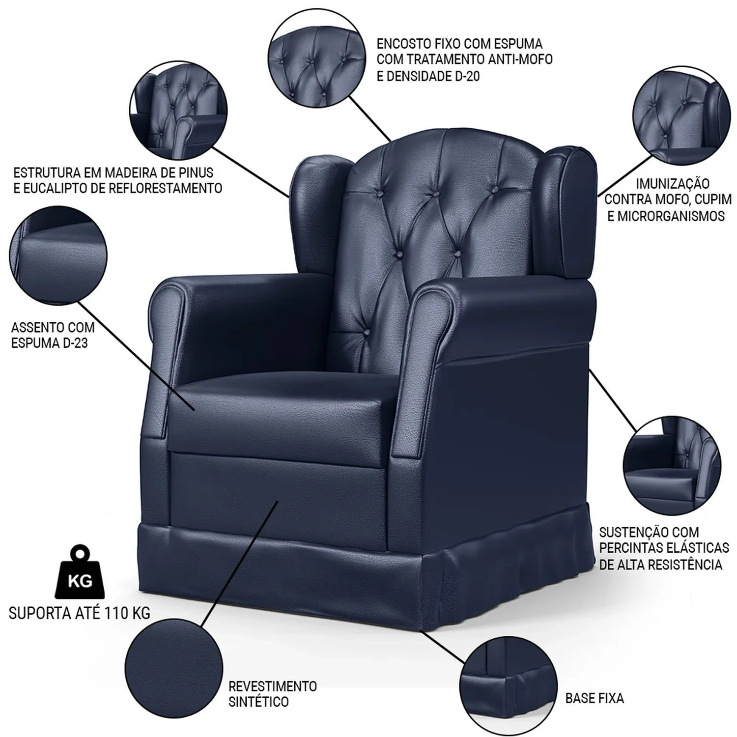 A Poltrona de Amamentação Fixa Lucy Z39 Sintético Azul Marinho - Mpozenato é a escolha perfeita para as mamães que buscam conforto e praticidade durante a amamentação. Fabricada com madeira de eucalipto de reflorestamento, ela é resistente e durável, além de ser ecologicamente correta. A poltrona conta com percintas elásticas, que oferecem maior conforto e durabilidade, e sua estrutura de madeira é imunizada contra mofo, cupim e microrganismos, garantindo que ela dure por muito tempo. Com um design moderno e elegante, a Poltrona de Amamentação Fixa Lucy é a escolha perfeita para qualquer ambiente, seja no quarto do bebê, na sala de estar ou em qualquer outro cômodo. Invista em conforto e qualidade para você e seu bebê com a Poltrona de Amamentação Fixa Lucy. Compre já!