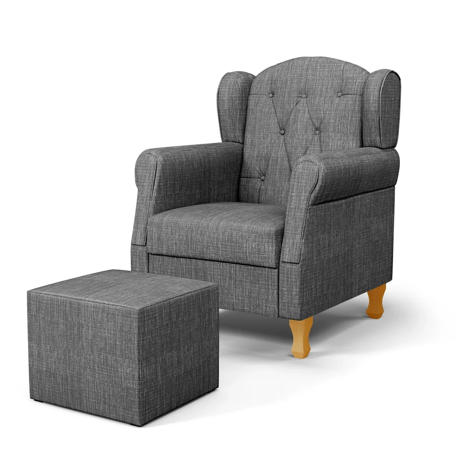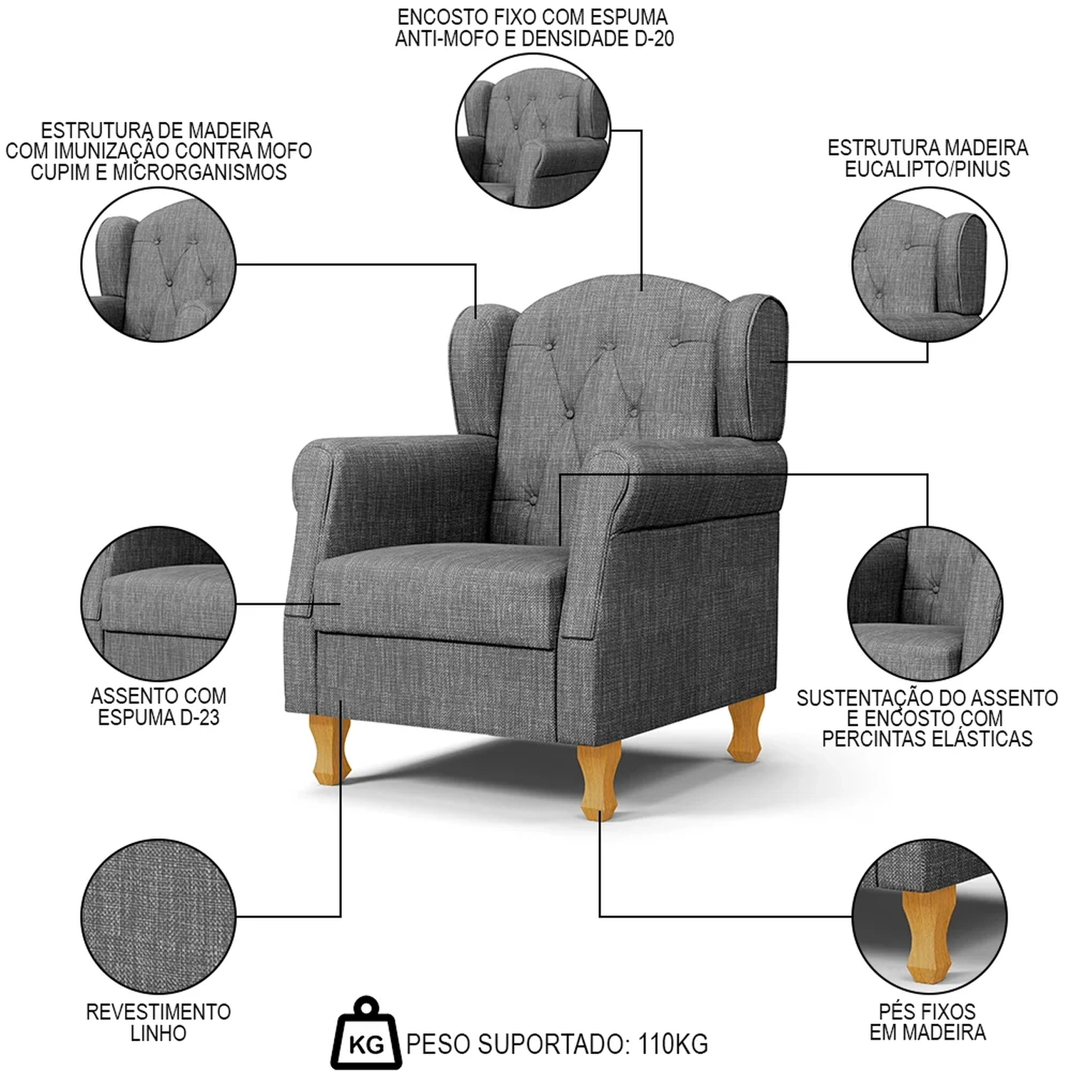 Conteúdo da Embalagem: 1 Poltrona, 4 Pés de Madeira, 1 Puff.