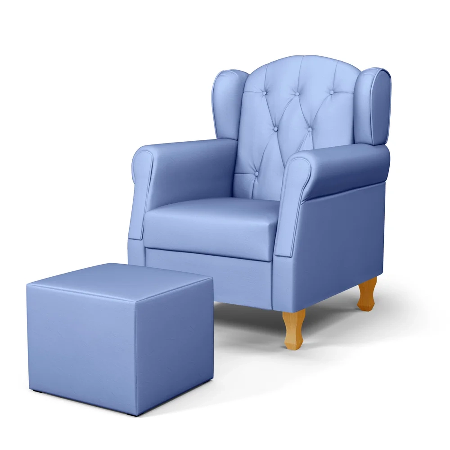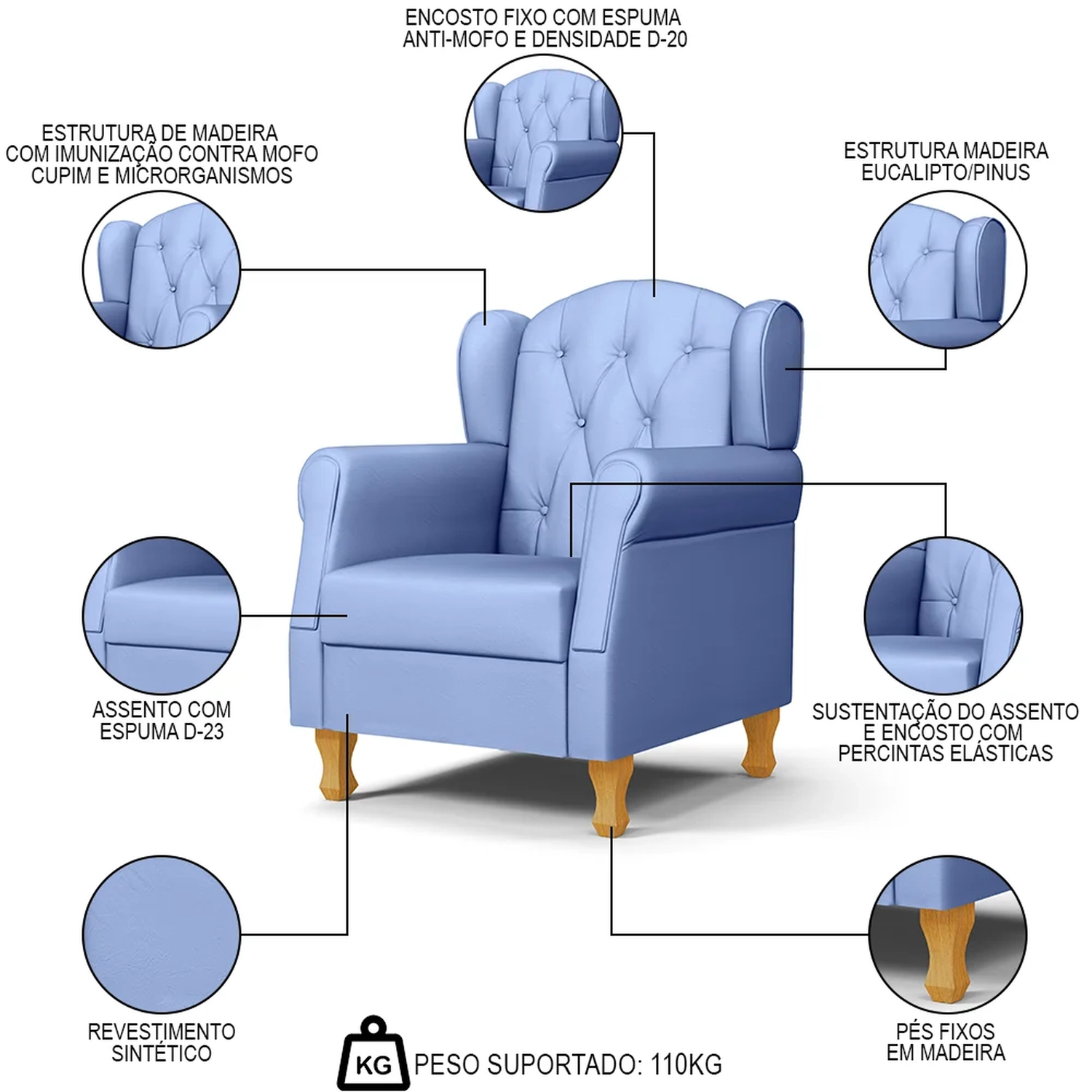 Conteúdo da Embalagem: 1 Poltrona, 4 Pés de Madeira, 1 Puff.