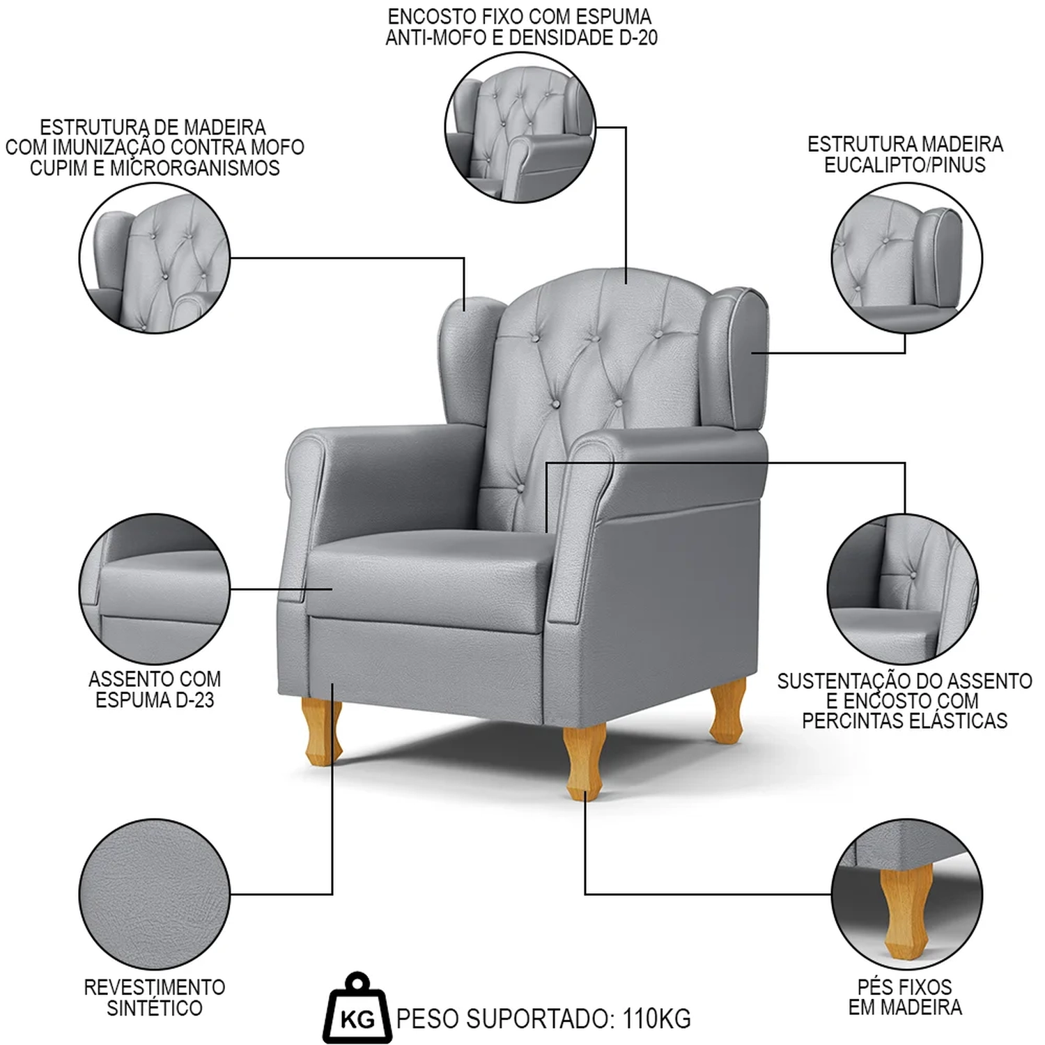Conteúdo da Embalagem: 1 Poltrona, 4 Pés de Madeira, 1 Puff.