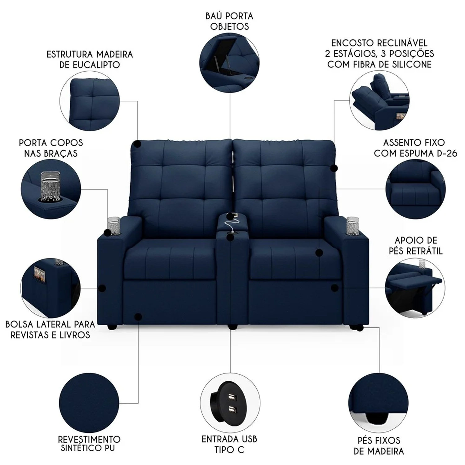Conheça a Poltrona de Cinema Reclinável 2 Lugares Baú USB Mallie FH9 PU Azul, da Mpozenato projetada para oferecer o máximo conforto e ter seu próprio cinema em casa.