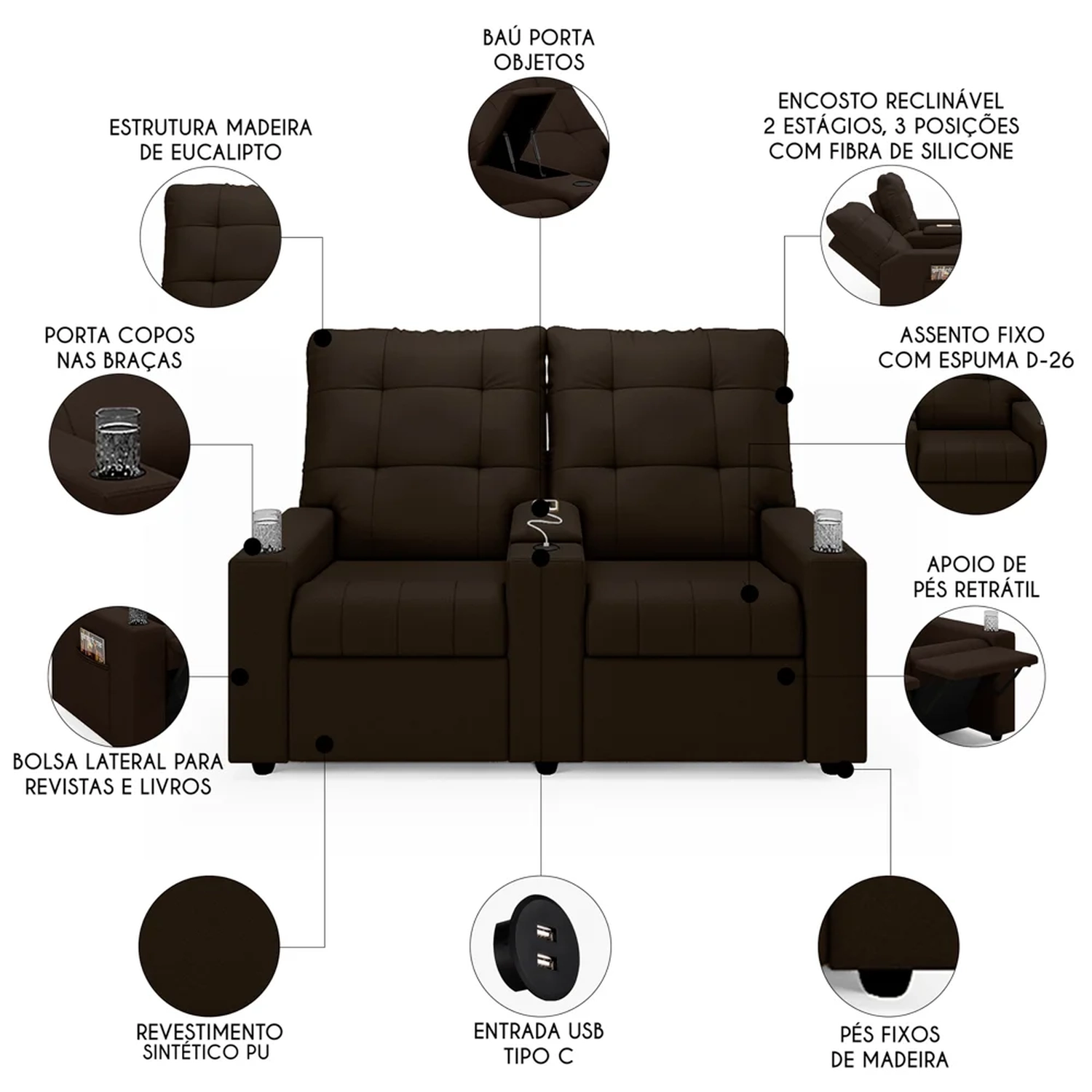 Conheça a Poltrona de Cinema Reclinável 2 Lugares Baú USB Mallie FH9 PU Marrom, da Mpozenato projetada para oferecer o máximo conforto e ter seu próprio cinema em casa.