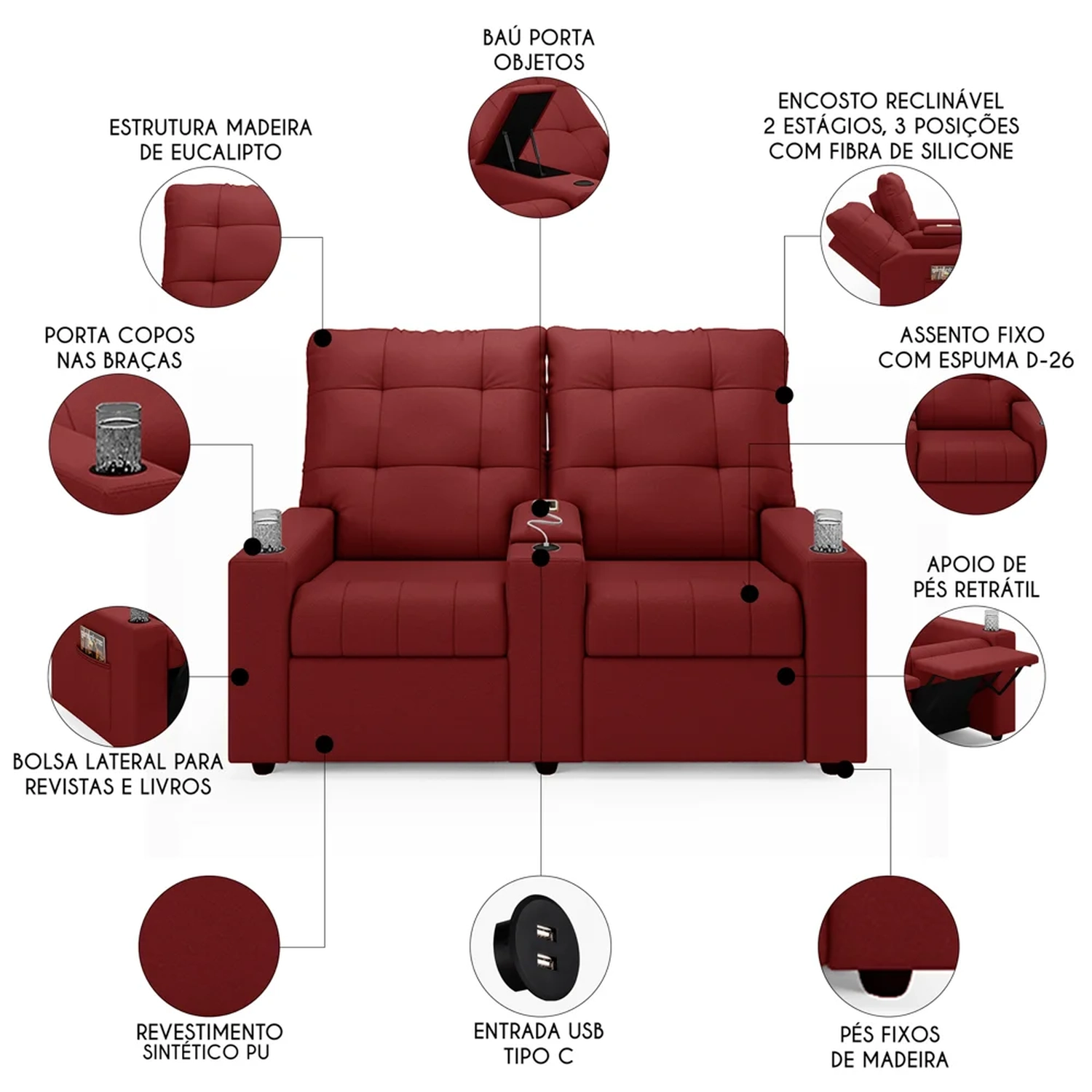 Conheça a Poltrona de Cinema Reclinável 2 Lugares Baú USB Mallie FH9 PU Vermelho, da Mpozenato projetada para oferecer o máximo conforto e ter seu próprio cinema em casa.
