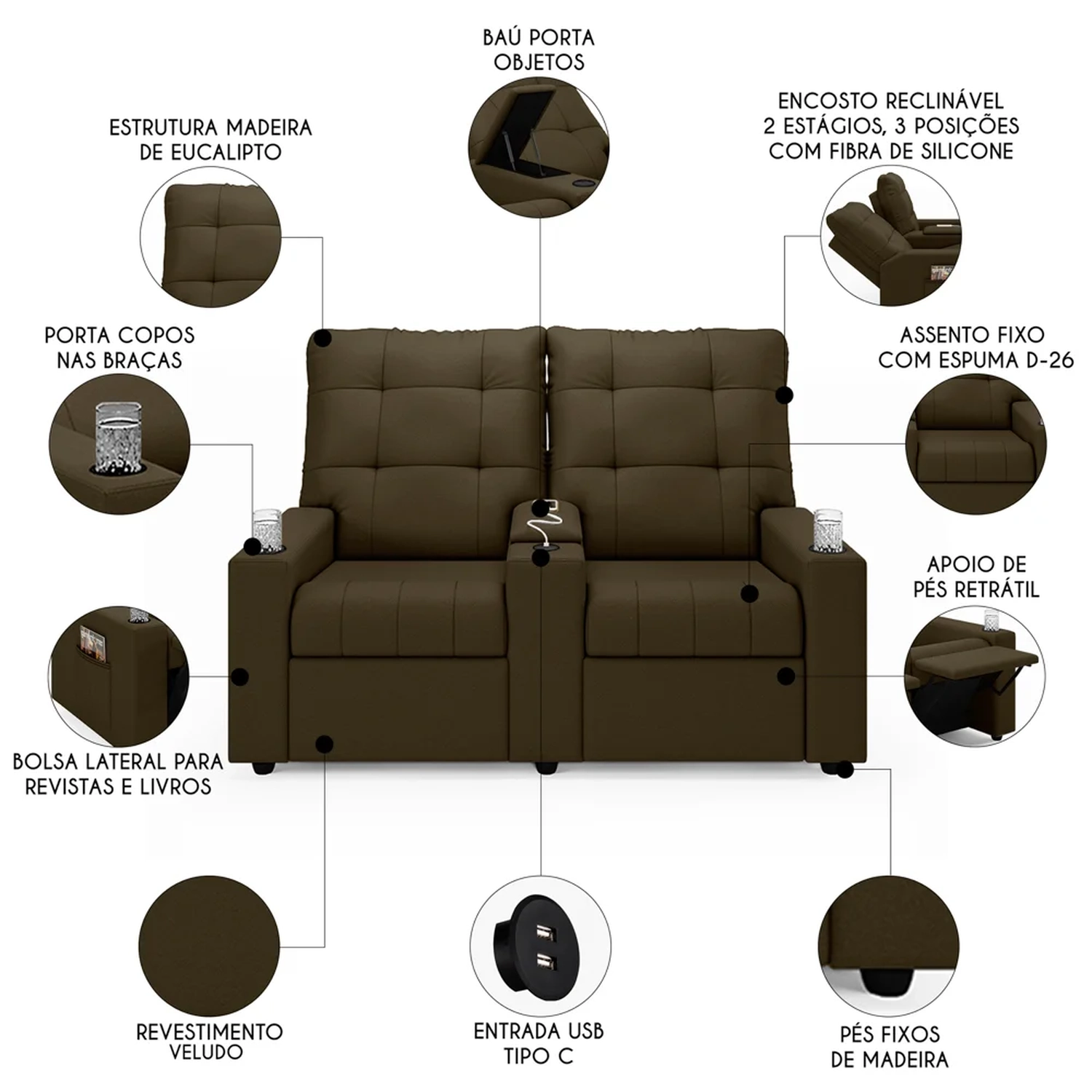 Conheça a Poltrona de Cinema Reclinável 2 Lugares Baú USB Mallie FH9 Veludo Capuccino, da Mpozenato projetada para oferecer o máximo conforto e ter seu próprio cinema em casa.