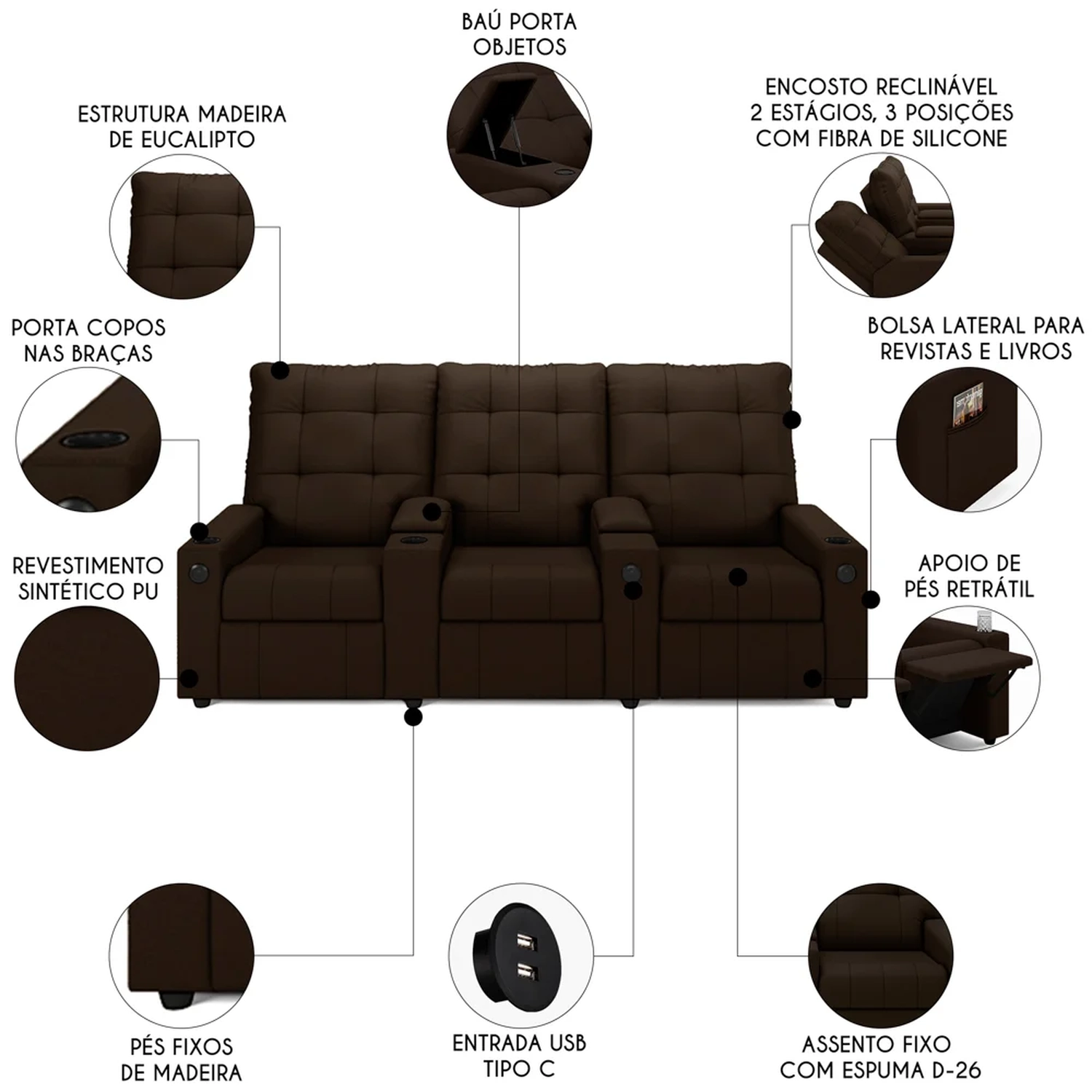 Conheça a Poltrona de Cinema Reclinável 3 Lugares Baú USB Mallie FH9 PU Marrom, da Mpozenato projetada para oferecer o máximo conforto e ter seu próprio cinema em casa.