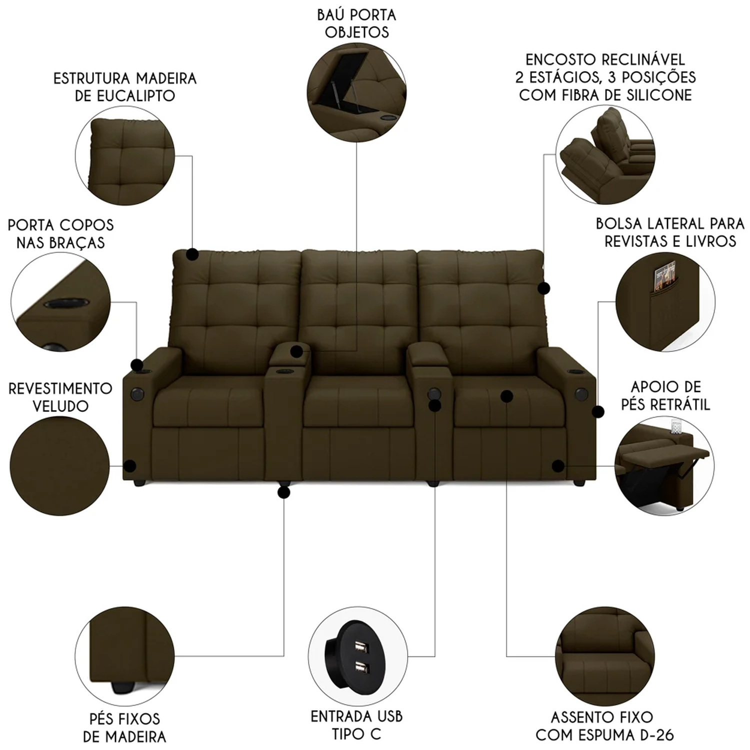 Conheça a Poltrona de Cinema Reclinável 3 Lugares Baú USB Mallie FH9 Veludo Capuccino, da Mpozenato projetada para oferecer o máximo conforto e ter seu próprio cinema em casa.