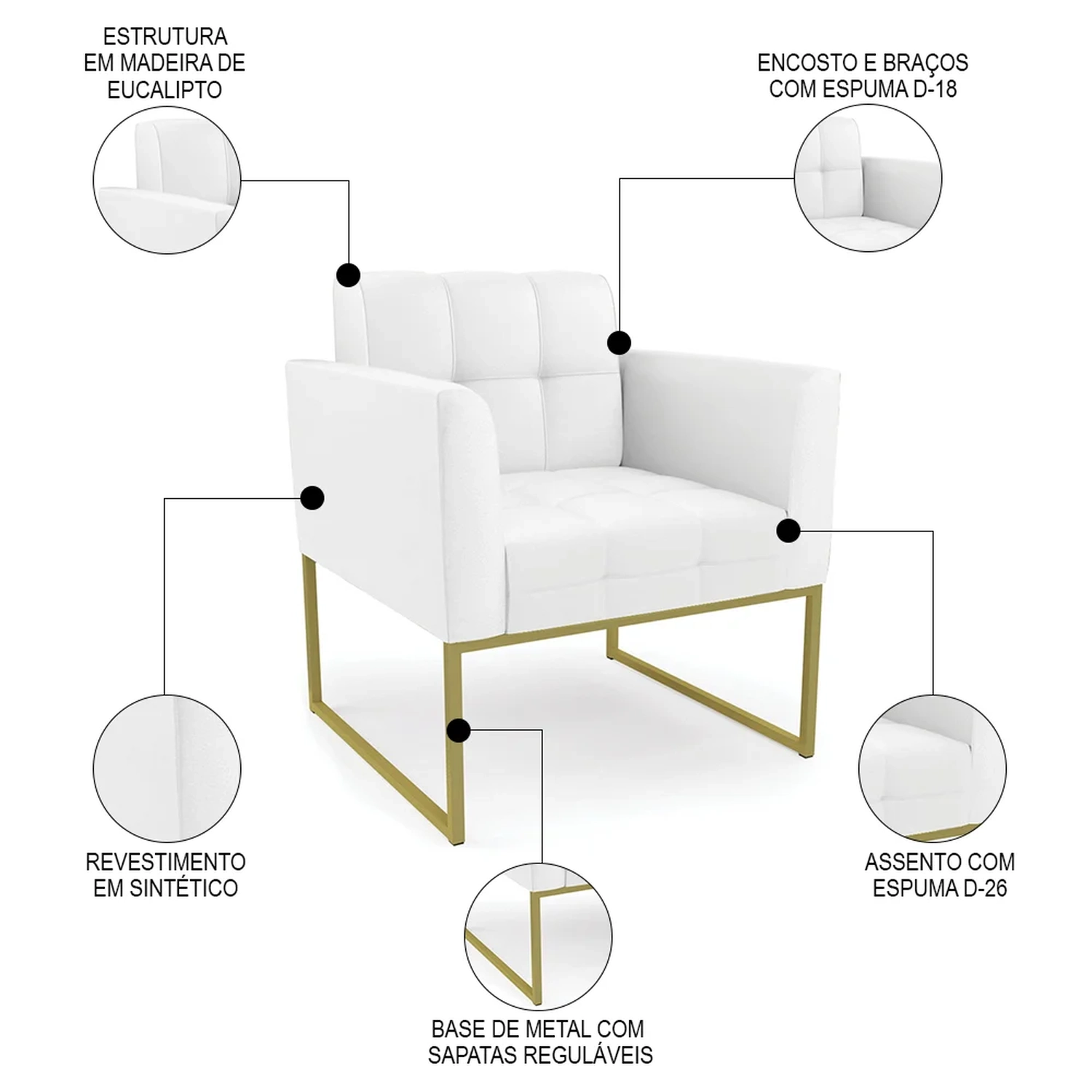 Você está procurando uma poltrona que combine com a sua Sala De Estar, recepção ou seu quarto, que ofereça conforto e qualidade? Então você vai adorar a Poltrona Decorativa Base Industrial Dourado Ana Sintético Branco, da Ibiza!