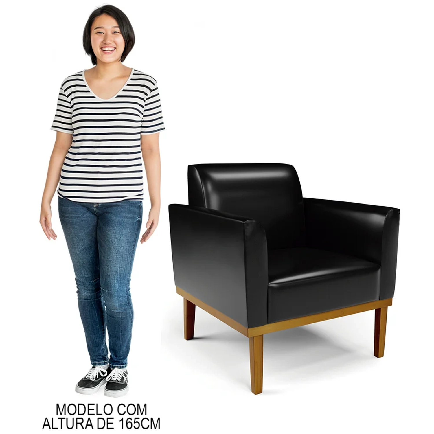 Você está procurando uma poltrona que combine com a sua Sala De Estar, recepção ou seu quarto, que ofereça conforto e qualidade? Então você vai adorar a Poltrona Decorativa Base Madeira Castanho Maressa Sintético PU Preto, da Ibiza!